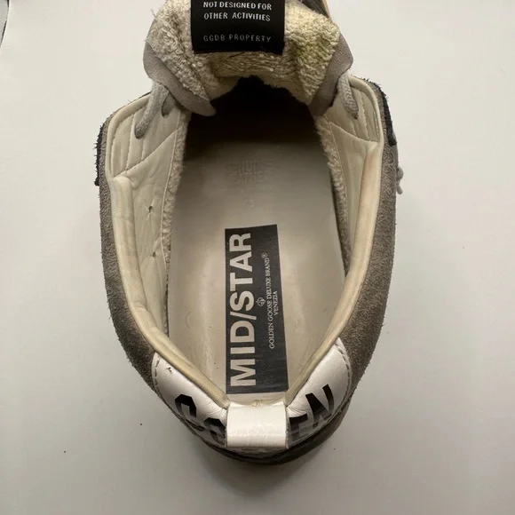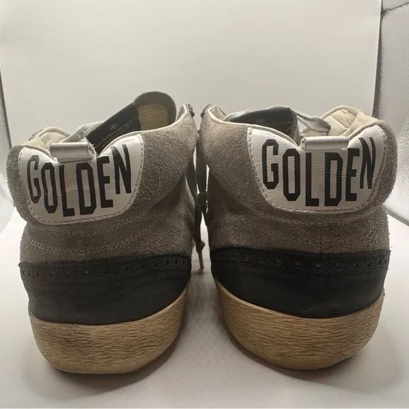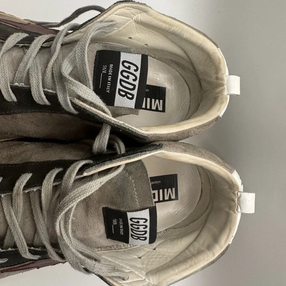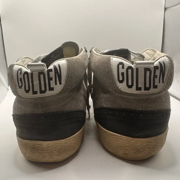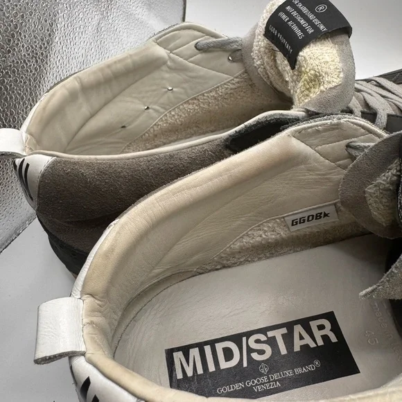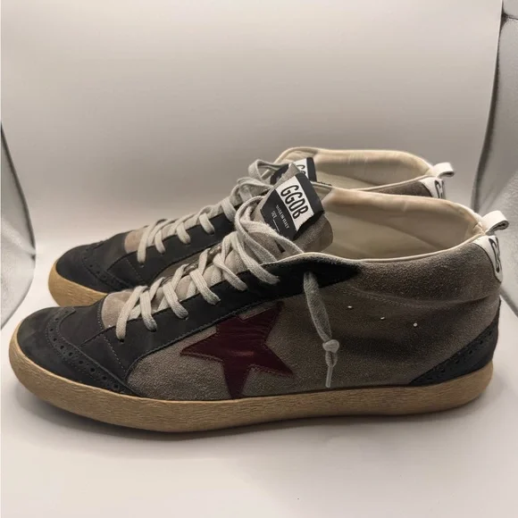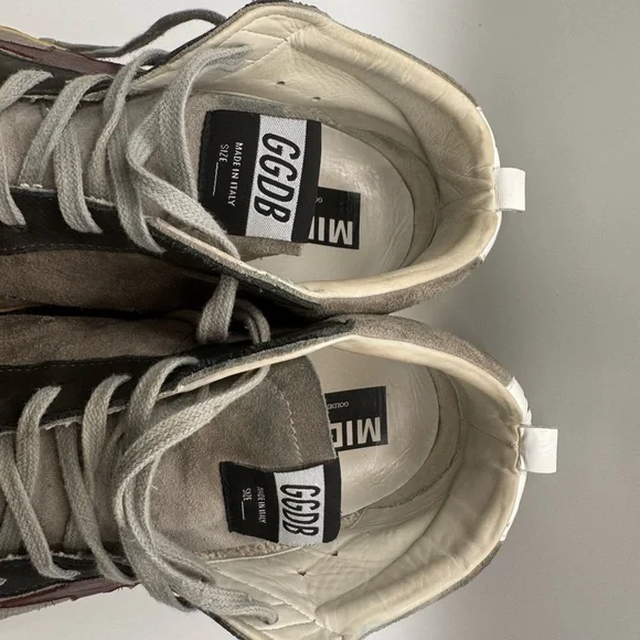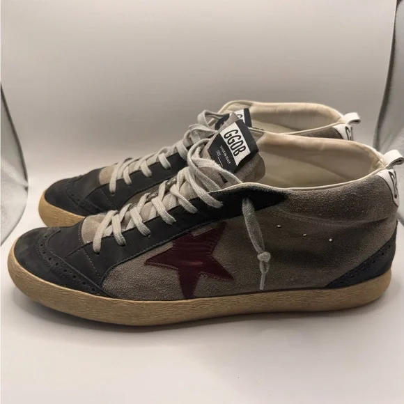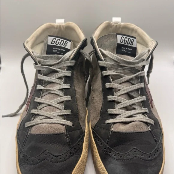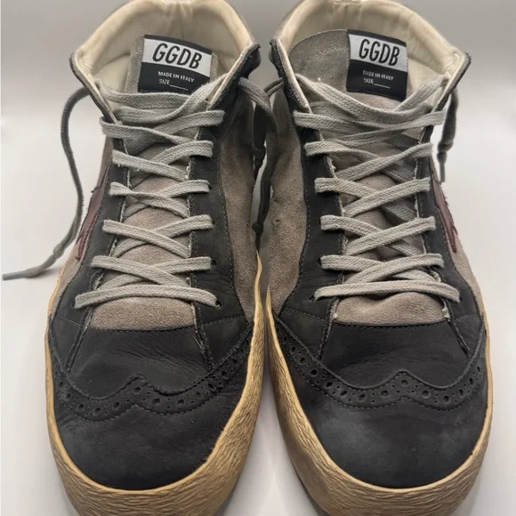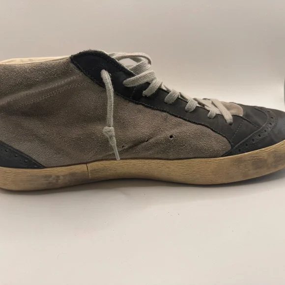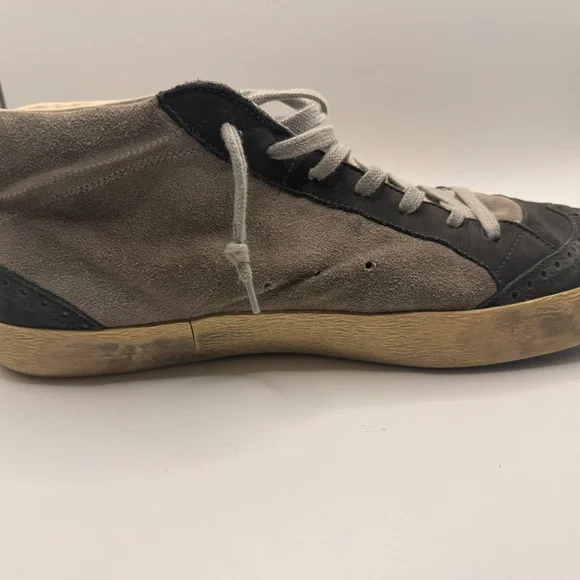 Men’s GOLDEN GOOSE SNEAKERS - SIZE 45Barely worn ( reference bottom of shoe picture)These sneakers boast a sleek black and gray color scheme, crafted from a soft suede material for a casual yet sporty look. The high-top design extends above the ankle, providing both style and support. Light gray laces and a decorative toe cap add a touch of contrast and texture to these versatile shoes.