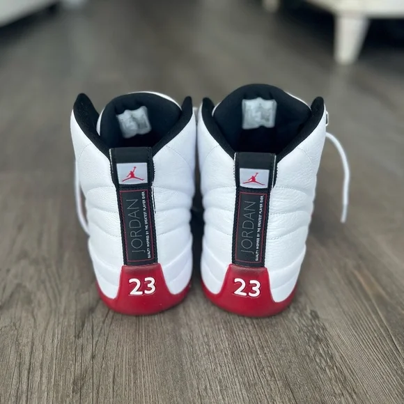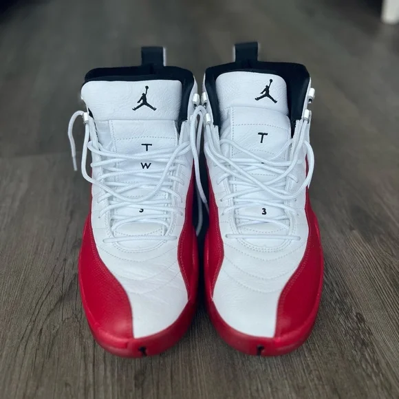 Stylish Jordan sneakers. White leather upper. Bold red accents. Iconic design.