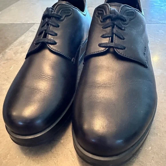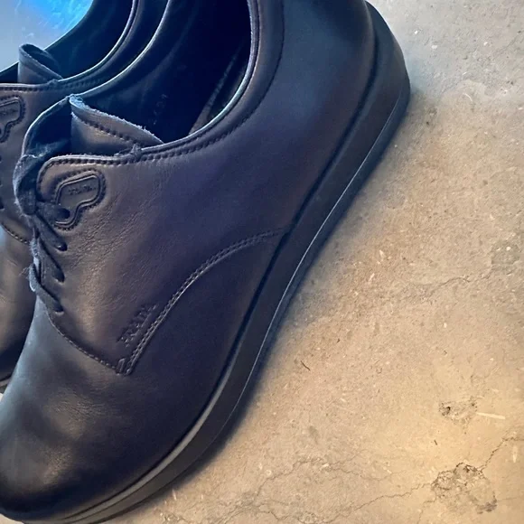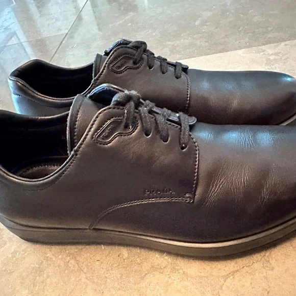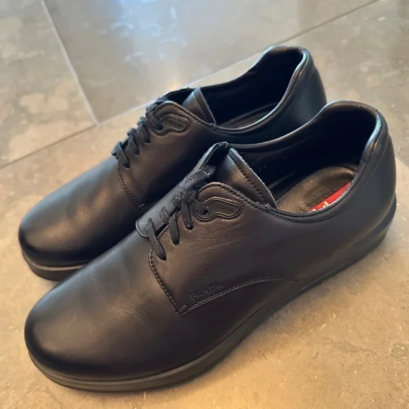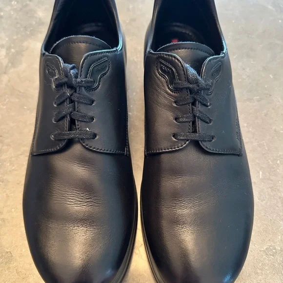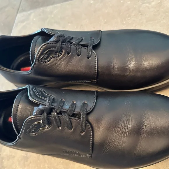 Rare, great looking, very stylish PRADA sport Milano Soft calf black soft leather shoes, lace-up, Calzature Uomo. Derby styleUsed, gently worn/pre-owned, normal to very minimal...