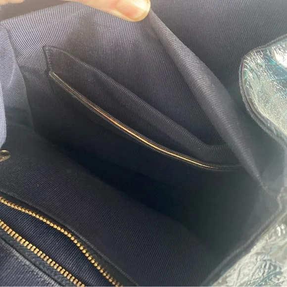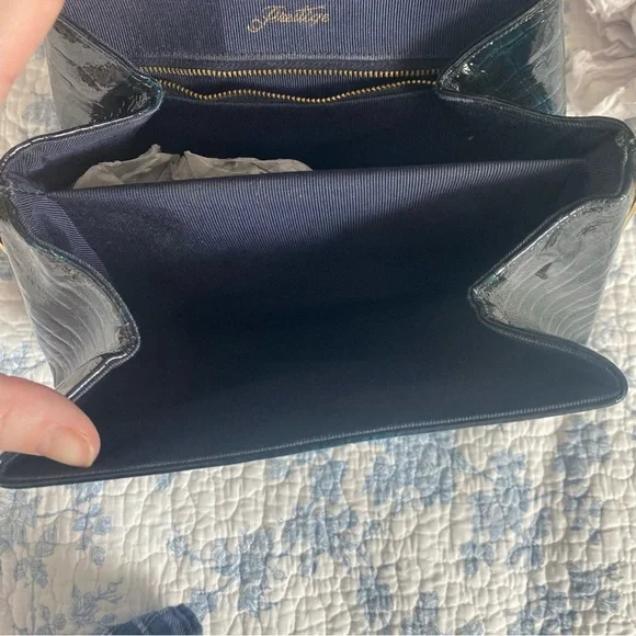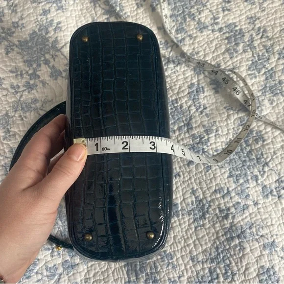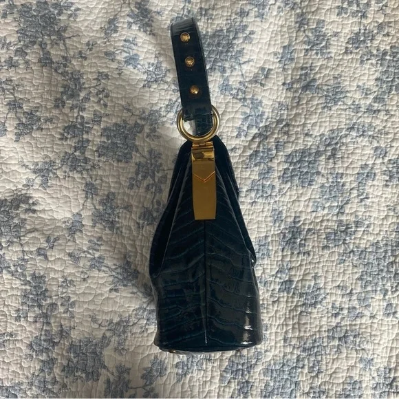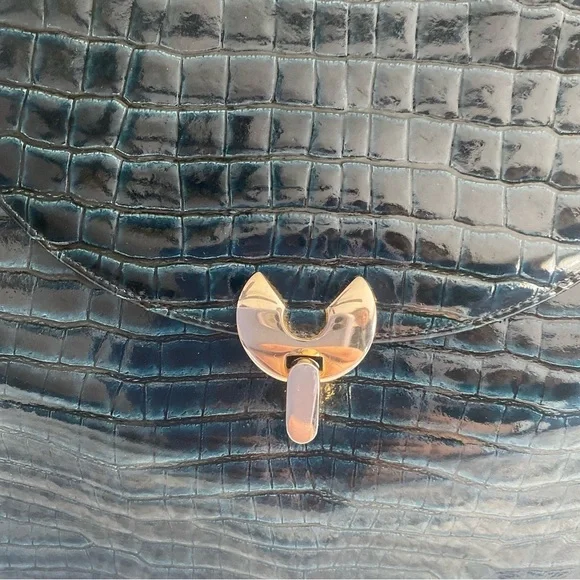 This is a 1950’s mid-century vintage emerald green croc leather handbag with gold hardware and accents by the brand Prestige. A very rare piece. It’s in pristine condition and...