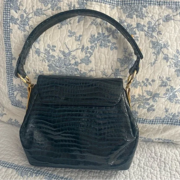 Prestige 1950’s Mid-Century Emerald Vintage Croc Handbag with Gold Hardware RARE
