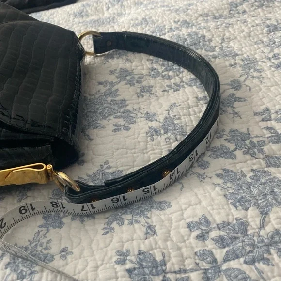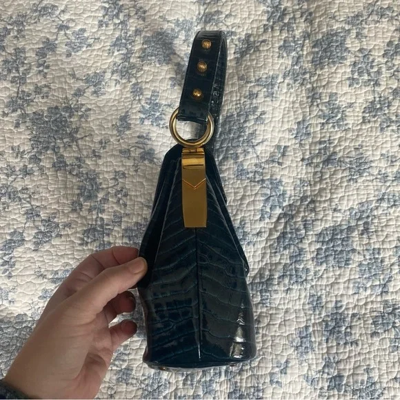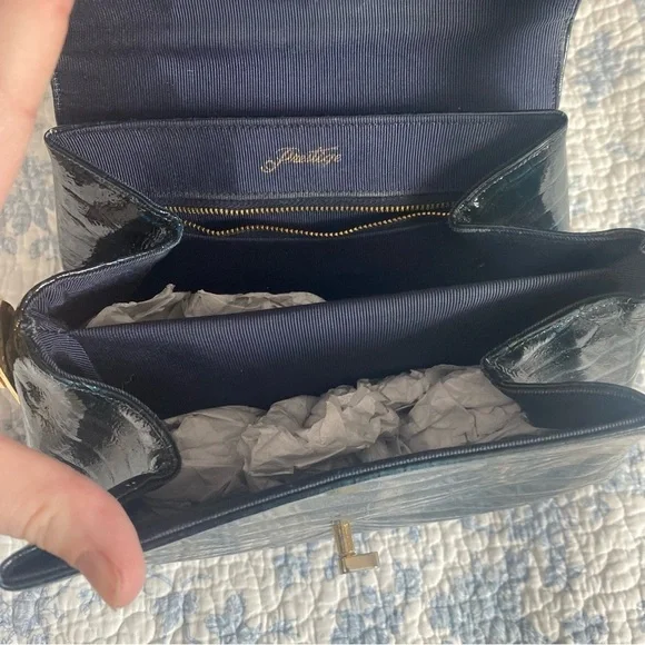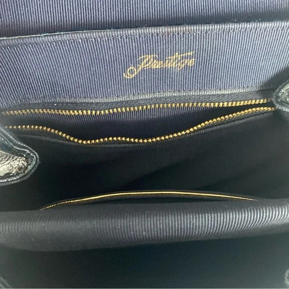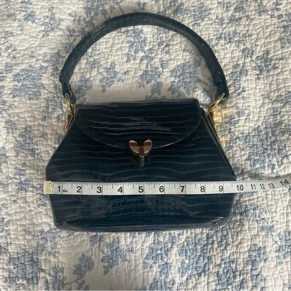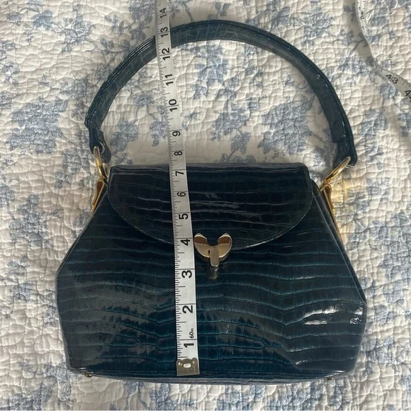 This is a 1950’s mid-century vintage emerald green croc leather handbag with gold hardware and accents by the brand Prestige. A very rare piece. It’s in pristine condition and has been well taken care of. It has two sections on the interior with a small pocket. This is the perfect piece for a special occasion or to have as a collectors item. It’s stunning. #vintage #midcentury #crocbag #timeless #glam