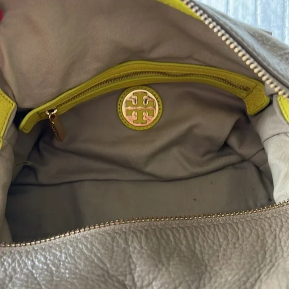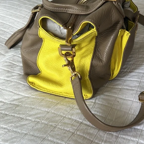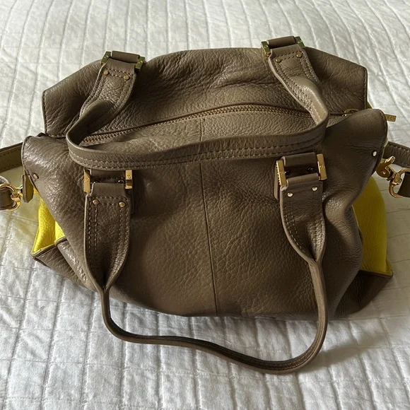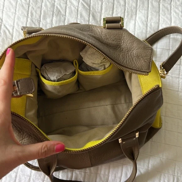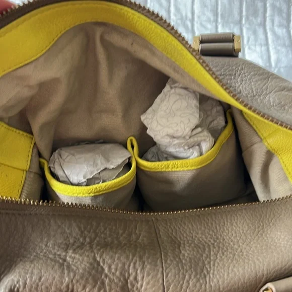 Light tan and yellow soft leather bag. Exterior pocket with clasp closure. Two short handles and one shoulder strap. Interior top zip with two open pockets and one zippered...