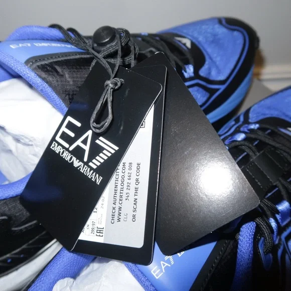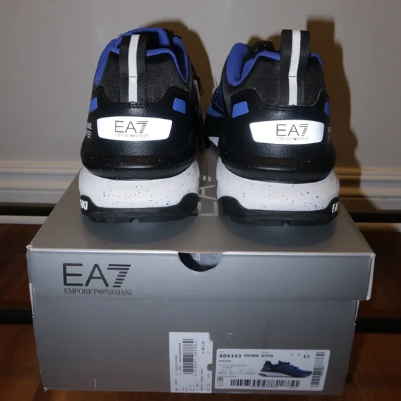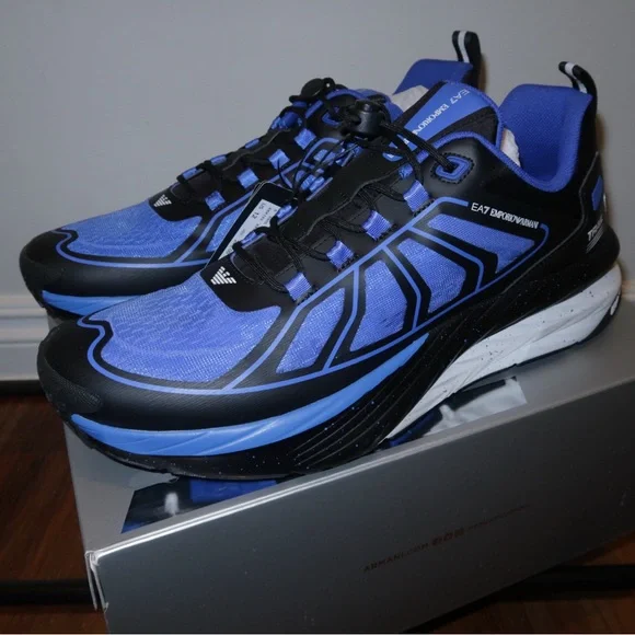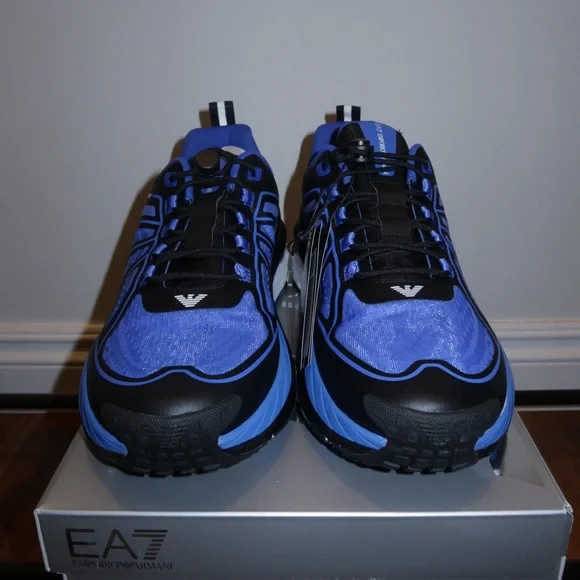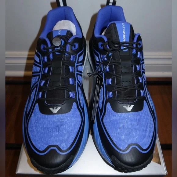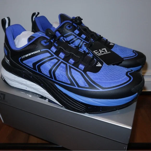 EA7 Stylish Emporio Armani athletic shoes. Features vibrant blue and sleek black design. Perfect for sports and casual wear.