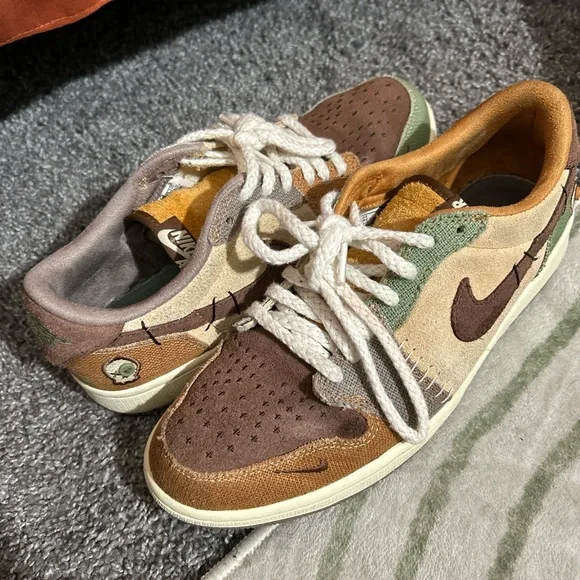 These Nike sneakers boast a vintage-inspired design with a multi-colored upper featuring brown suede and sage green accents. The classic low-top silhouette is complemented by white laces and light-colored soles, creating a versatile look perfect for casual wear.- Remember to like post to be notified about discounts and offers!