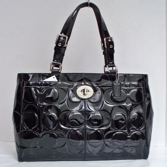 Gently owned COACH Hamptons Patent Leather Embossed Medium Carryall. F14413.Black Patent.Beautiful patent embossed leather with a turnlock closure on the front pocket, hidden top...