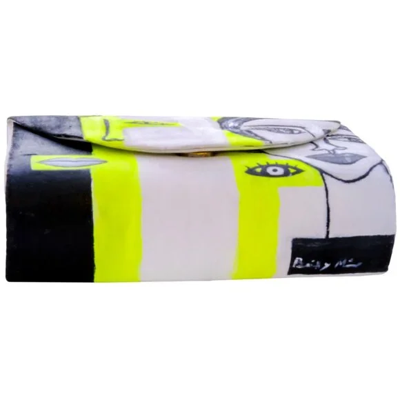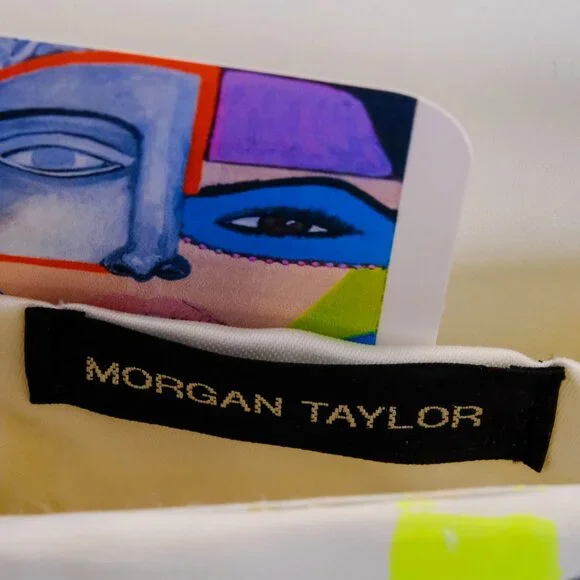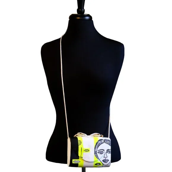 About the Product:Hand painted and signed by Brittany Minnes PraverWhite Morgan Taylor satin cross body purseUp-cycled thrift in like new conditionW 6.5" x H 4.5"One of a kindAbout the Artist:Brittany Minnes Praver is the artist behind the brand Temporarily Not Famous. The subjects of her paintings are otherworldly and odd looking, what she describes as deconstructed beauty, creating faces that look collage-esque, combining different styles and elements like enlarged lips and asymmetrical features. She’s fascinated by the standards of beauty women strives to attain throughout all different periods of history and you will find that there are subtle nods to different cultures and eras within her works.Because of her love for fashion, specifically more out-of-the box type designers like Alexander McQueen and Mason Margiela, she always creates her art with the idea that it could be wearable, and her compositions hold a design element to them. Her abstract ‘custom textile designs’ like her line art faces and geometric patterns, show up over and over again in her paintings. These unique designs symbolize different ideas and have deep meanings behind them.