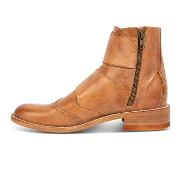 Freebird´s tan leather boots showcase a vintage-inspired design with a burnished finish, offering a unique blend of style and character. The high-quality construction is evident in the visible stitching and stacked leather heel, ensuring durability and timeless appeal. These versatile boots are perfect for adding a touch of sophistication to any casual or refined occasion.