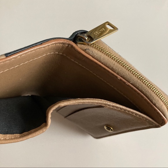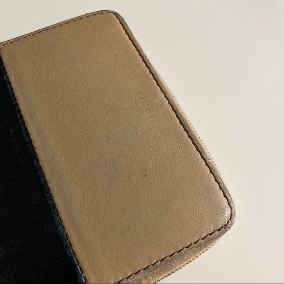 In used condition, but still beautiful and functional. Features a snap enclosure with card and bill slots, as well as a zip around coin pouch. Black and beige/tan. From “old celine” Pheobe Philo collections. 4.5”x3.75”