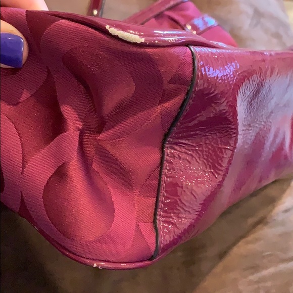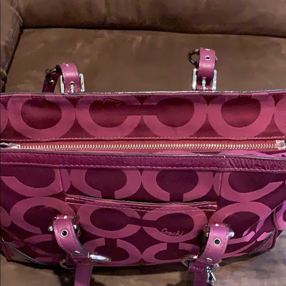 Authentic burgundy Coach satchel. Zipper closure with one large zippered pocket and two open pockets on the inside. Slip pocket on the front with leather trim. Minor ink stains on...
