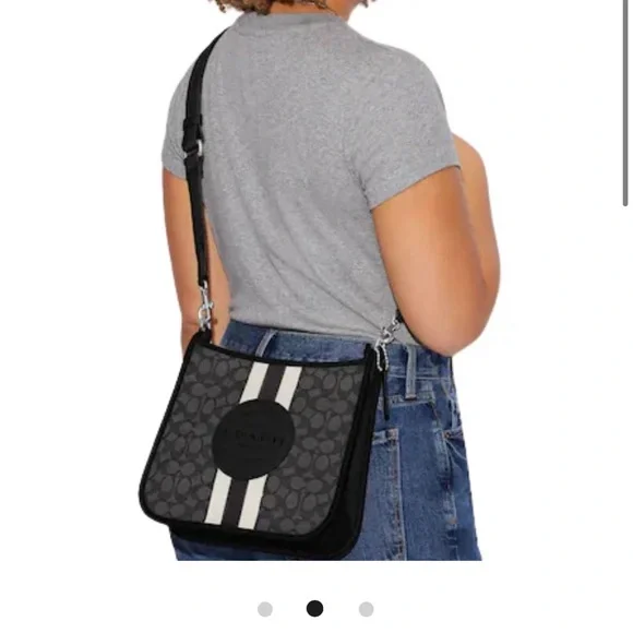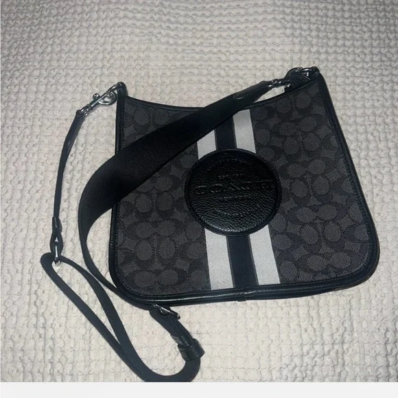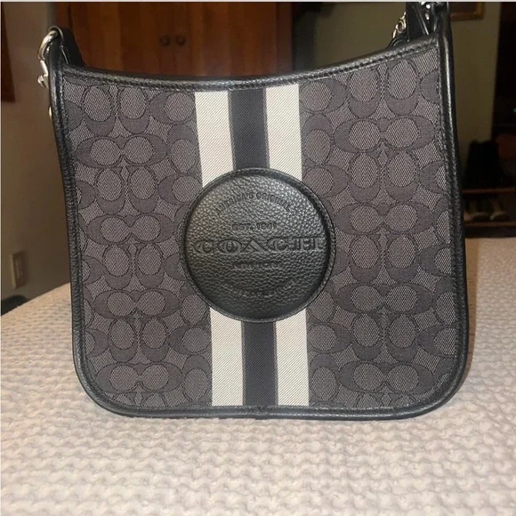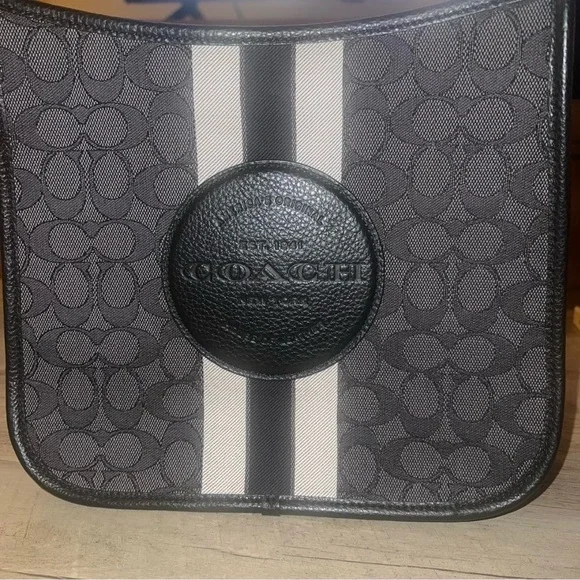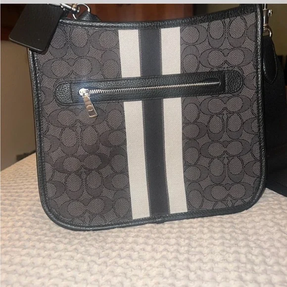 Elegant Coach crossbody with signature pattern. Features black and white stripes and logo emblem. Like new I used just one time , perfect condition