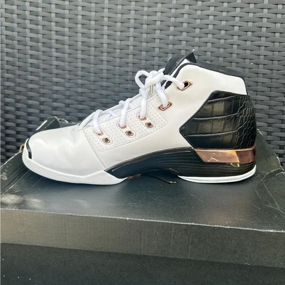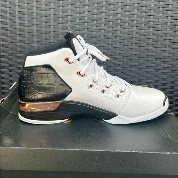 Stylish white sneakers with black accents. Features the iconic Air Jordan logo.Air Jordan retro 17 Og box but not in perfect condition Replacement insole