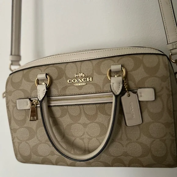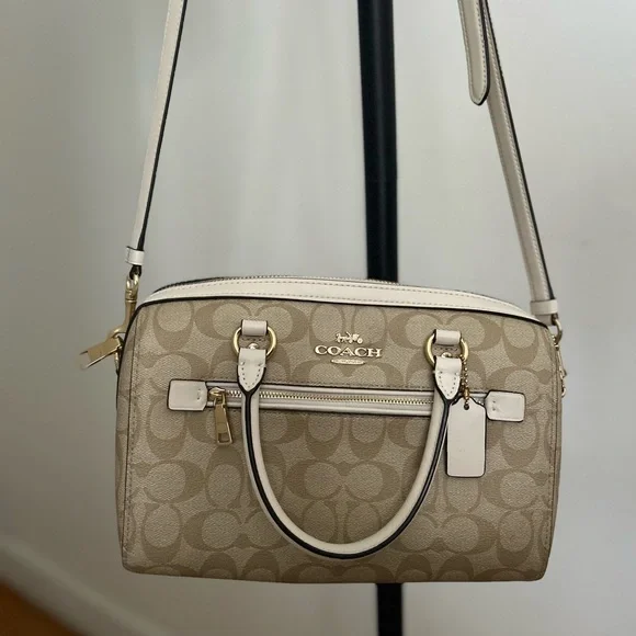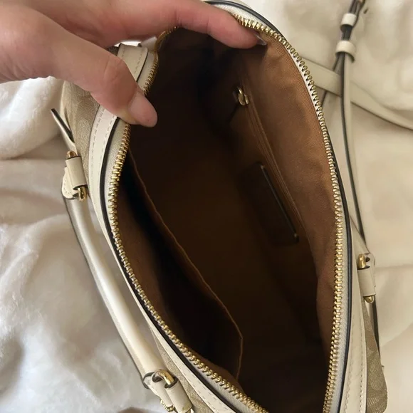 I received this as a gift and wore it a few times, but it’s not my style. It’s in great condition.This elegant Coach satchel in a sophisticated cream color is a timeless addition to any wardrobe. Crafted with gold-tone hardware and a structured design, it offers both style and functionality. The versatile cream hue ensures it complements a variety of outfits effortlessly.