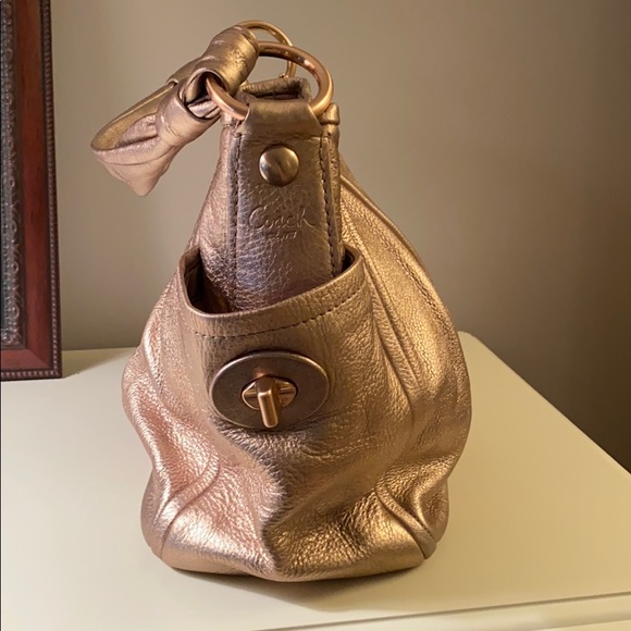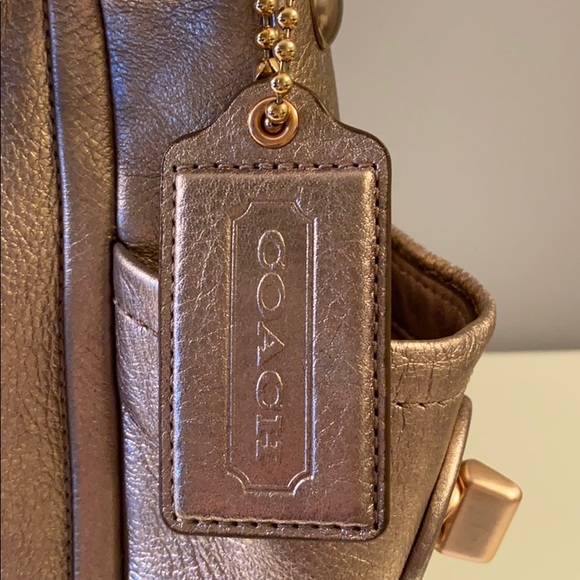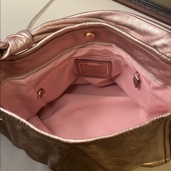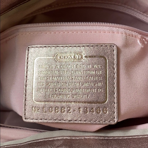 Like new coach bag.11” high x 6” deep x 12” wide.Soft, pebble leather, rose gold hardware and blush pink lining.2 interior pockets perfect for phone storage.Another larger interior pocket includes a zipper.Classic Coach keychain included.2 exterior side pockets with iconic coach toggle.The rose goldleather is fabulous and can be styled as a neutral.The condition of exterior and interior shows no signs of wear.The style is timeless.Original coach dust bag included.