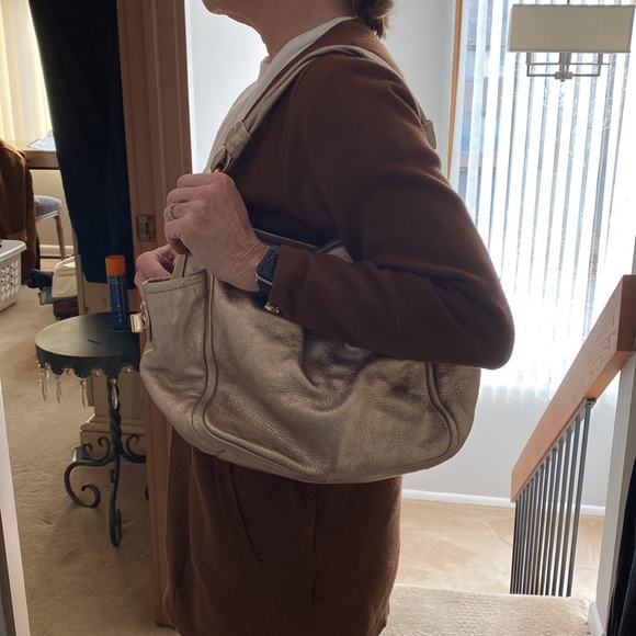 Like new coach bag.11” high x 6” deep x 12” wide.Soft, pebble leather, rose gold hardware and blush pink lining.2 interior pockets perfect for phone storage.Another larger...