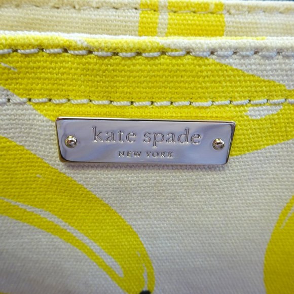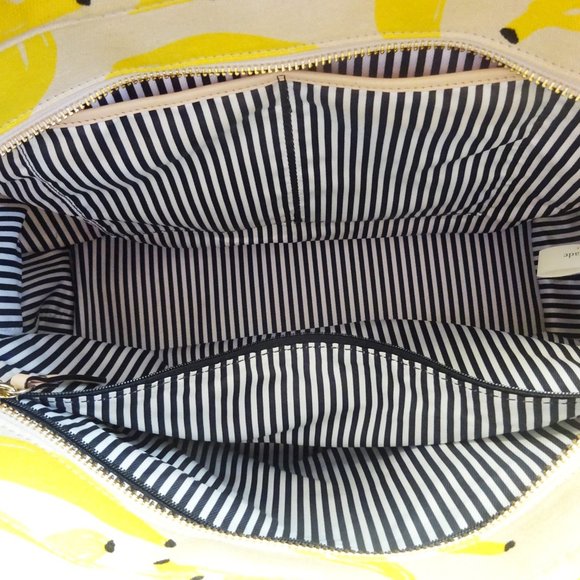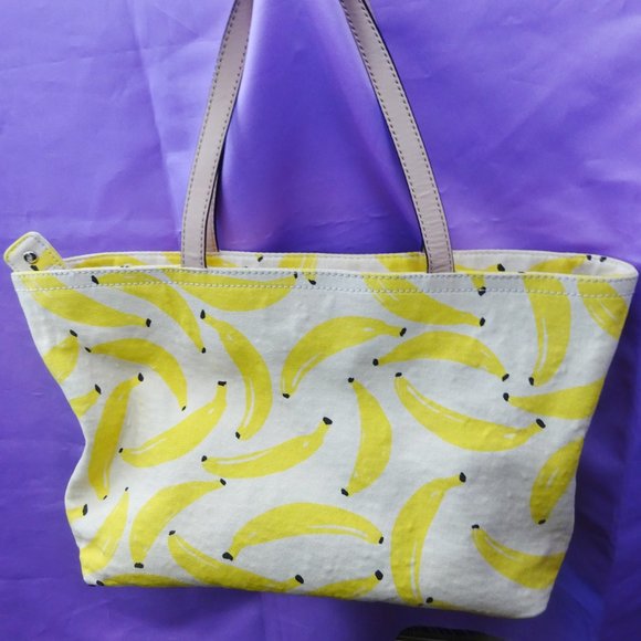 Kate Spade Designer That’s Banana’s Tote Bag in Canvas Yellow Banana print, with black and white pinstriped interior.The front reads “That’s Bananas” in black lettering and also bears the Kate Spade New York logo.Has a zip top for secure access. Interior has 2 slip pockets and 1 zip pocket.Original retail value of $198.Bag dimensions are about 13” long (bottom) by 18” long (top) by 6” wide by 9” tall. Straps have a drop height of about 8.5”.Excellent estate condition. Gently pre-owned.