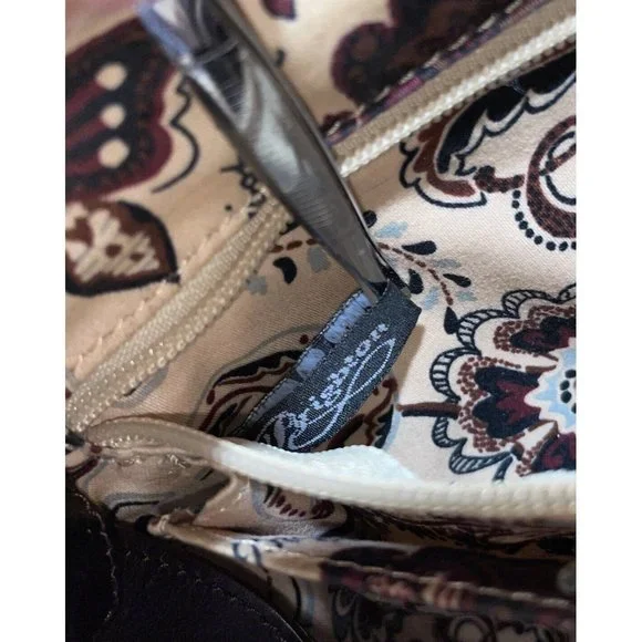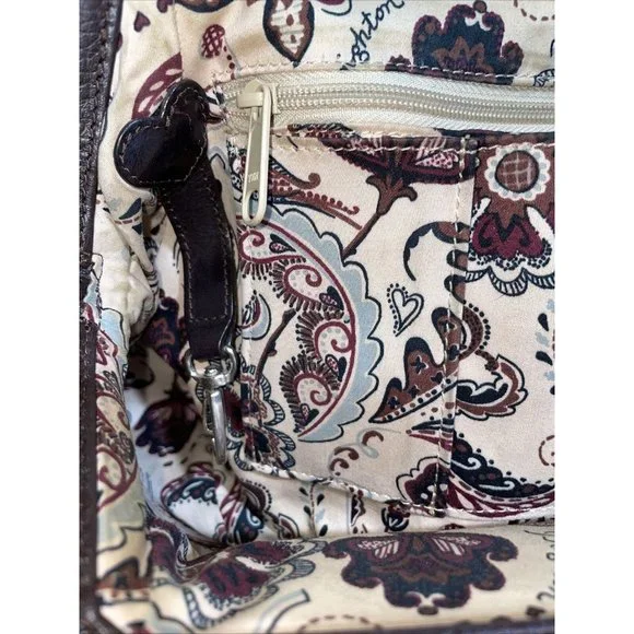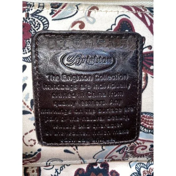 Elevate your style with this stunning Brighton Shoulder Bag. Crafted from croc-embossed brown pebbled leather, this bag features decorative silver hardware, a tassel, and a Brighton Heart charm for added elegance. The bag comes with a zip-around closure and a shoulder straps in brown leather.This vintage bag is perfect for any occasion. With its spacious interior lined with multicolor fabric and inner and outer pockets, you can easily keep your essentials organized. The bag is perfect for party/cocktail, casual, formal, workwear, and business settings. The bag´s shape is trapezoid, and its size is large, making it a perfect accessory for anyone looking to make a statement.Handbag is in great condition with some normal very light wear. Serial number D189515. Vintage items are sold as is. Please view all photos.