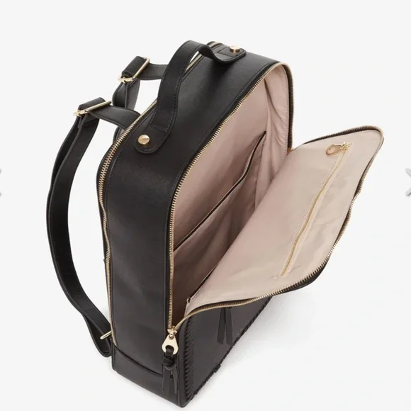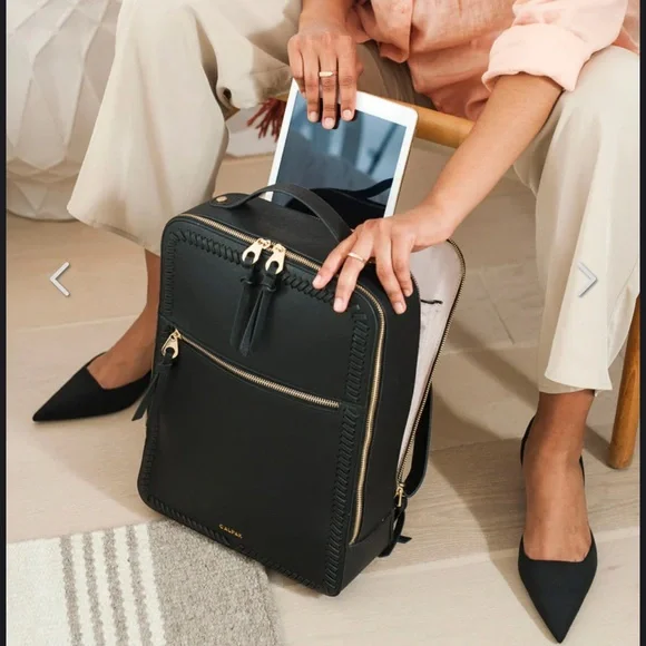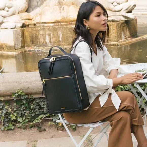 The Calpak Gingerleather backpack combines sleek design with high-quality craftsmanship, featuring a smooth matte finish and distinctive whipstitch detailing. Its structured, boxy shape offers excellent organization while maintaining a minimalist aesthetic, making it a versatile accessory for any occasion.