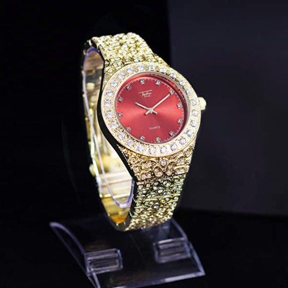 GOLD 44mm Iced Out Nugget Band Watch - Quartz MovementDIAL COLOR: Red; CASE COLOR: Gold; STRAP: Gold Nugget Patterned FinishWatch Dimensions: 44mm CASE DIAMETER; 8.5-inch STRAP...