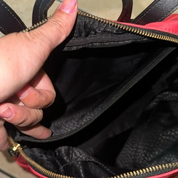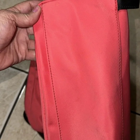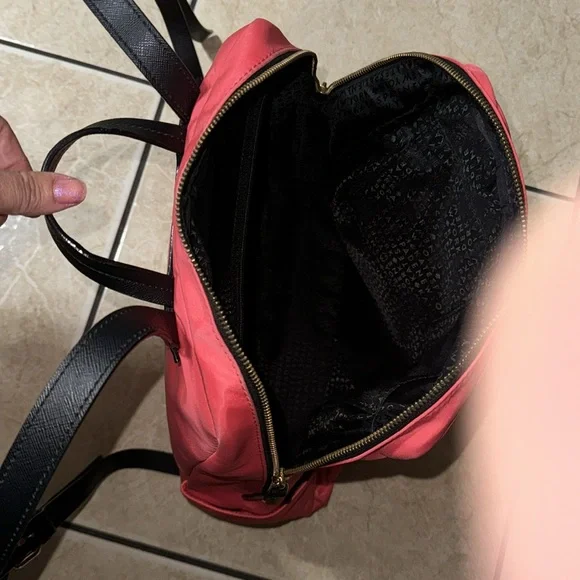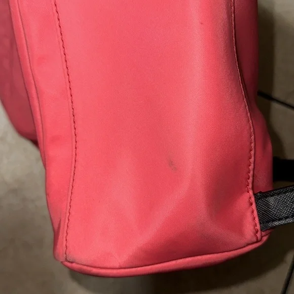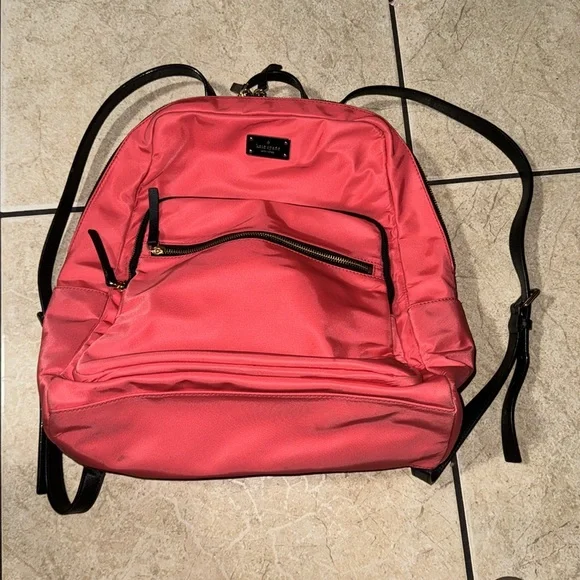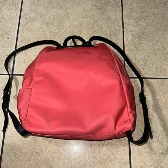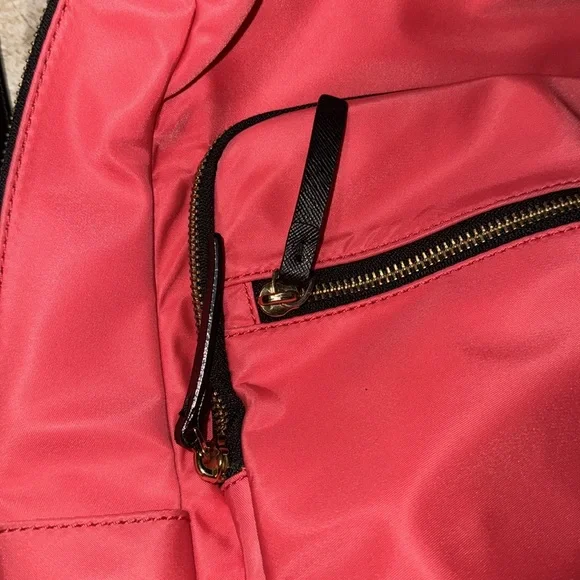 A fun, "crab red" (bright salmon) nylon backpack perfect for hopping on the plane or heading to the office. Laptop sleeve and two small pockets inside, with two medium pockets on the front of the bag.This backpack is like new and minimally used with barely noticeable markings on the front and the bottom (see last pictures). Straps and zippers are in excellent condition.You´ll love having this lightweight, colorful backpack for summer!. Note: Photo 1&4 are stock but similar. Approximately:Size: 14" L x 15" H x 6.5" W(CL)