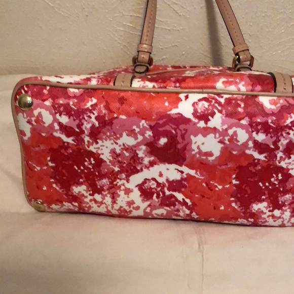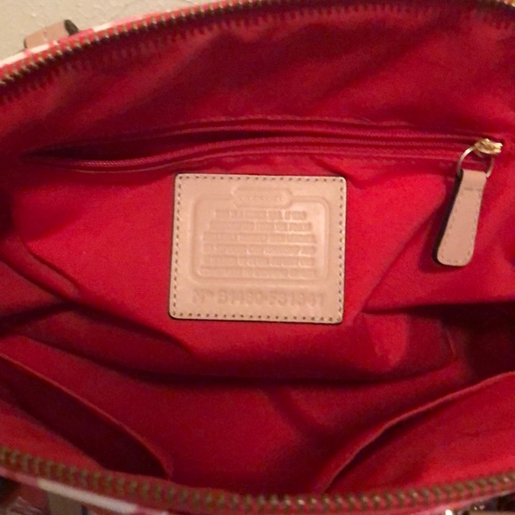 Gorgeous Coach bag, leather trim, removable crossbody handle, key fob, 3 inside pockets 1 outside pocket.