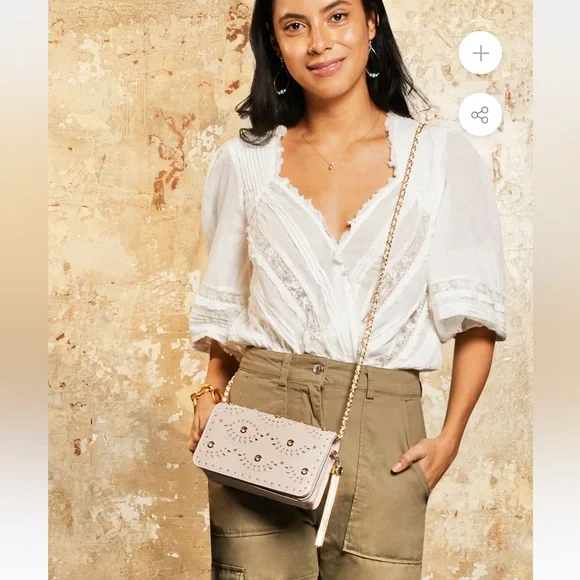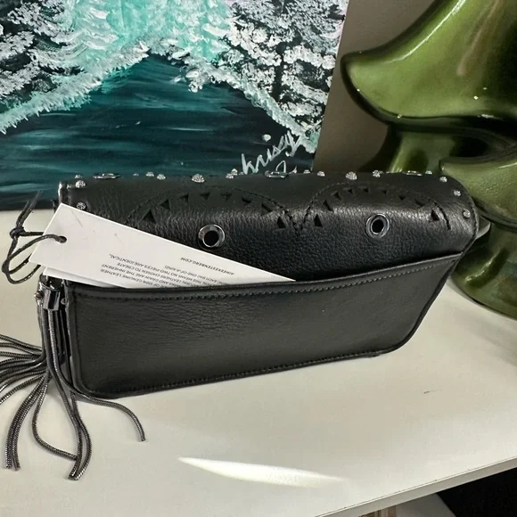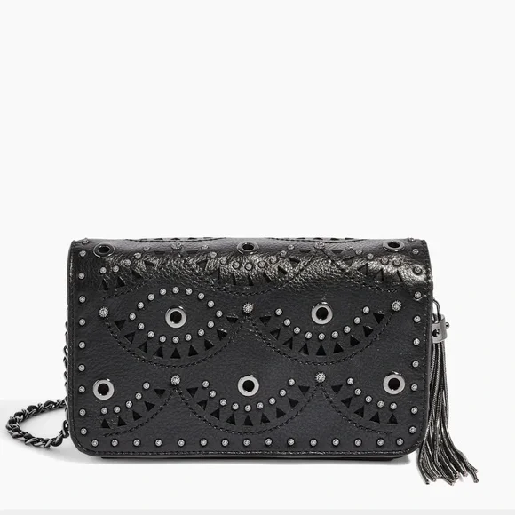 NWT Aimee KestenbergA practical, structured shape with secure flap entry gains its edge with a custom chain strap and tassel detail.Glove Tanned LeatherLaser cut design with studded detailsCustom hardwareSignature flap entry with magnetic snap closureChain shoulder strapExterior slip pocketInterior zip pocket and 3 interior credit card slotsStrap drop: 23.1”7.75“W x 4.75“H x 2.3“DWeight approximately 0.9lbsD3