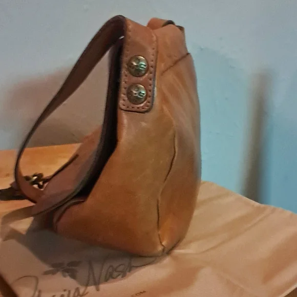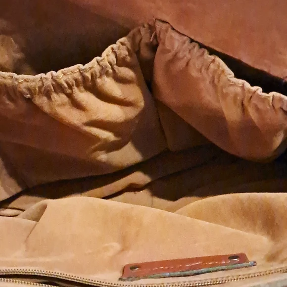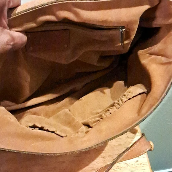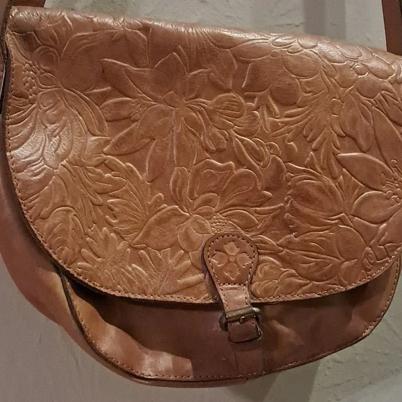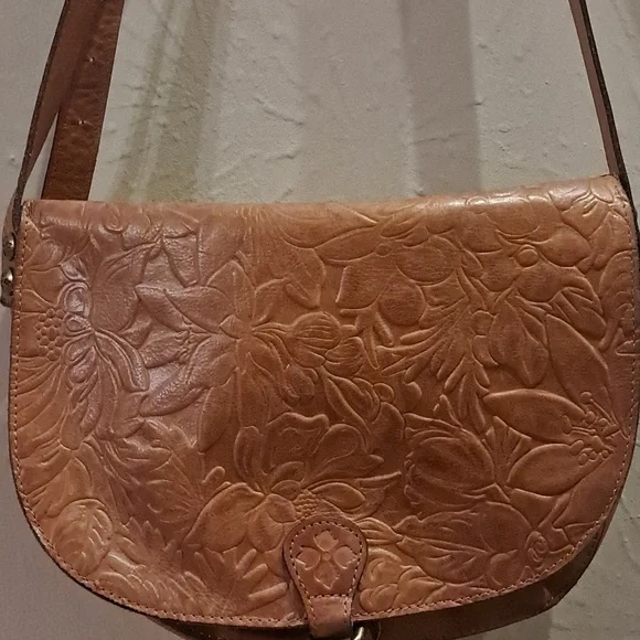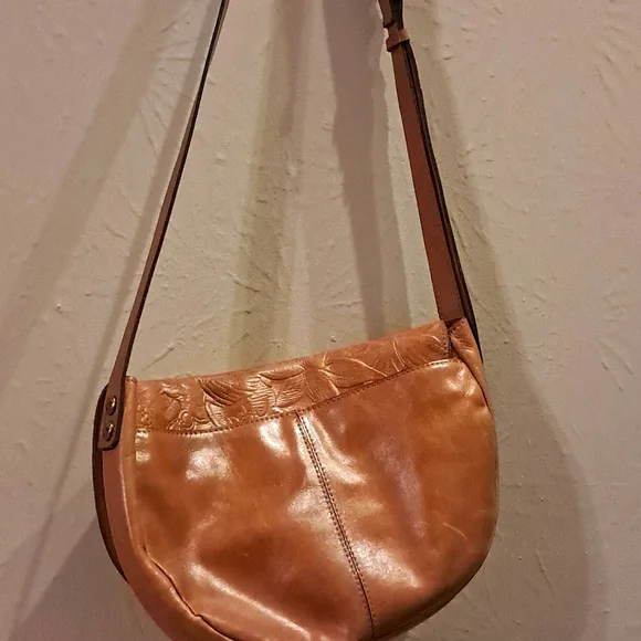 Camel color crossbody bag with floral embossed design, buckle closure, long strap and multi compartments, gently usedMeasurements are apprx 14 inch W,9 inch long and adjustable...