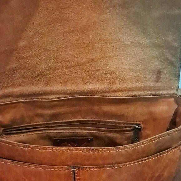 Camel color crossbody bag with floral embossed design, buckle closure, long strap and multi compartments, gently usedMeasurements are apprx 14 inch W,9 inch long and adjustable strap is over 25 inches long