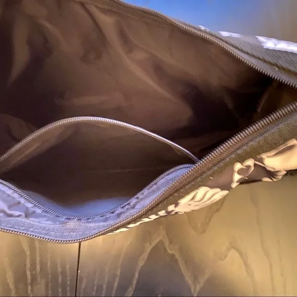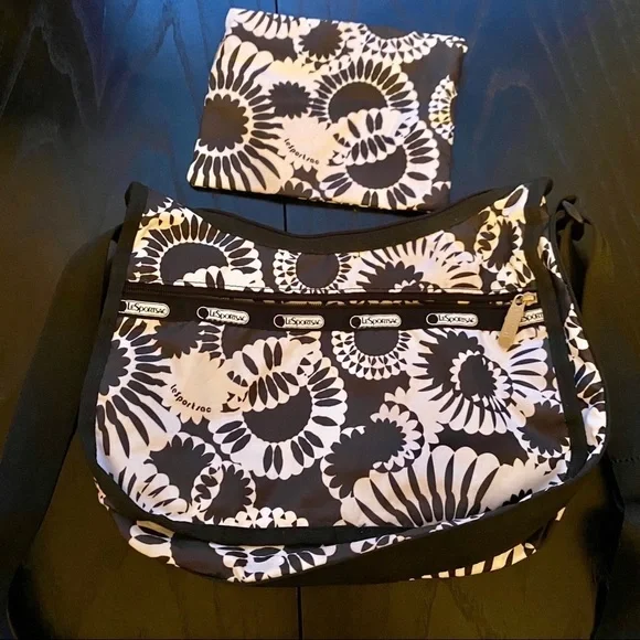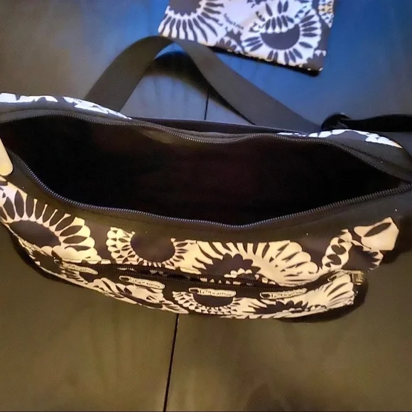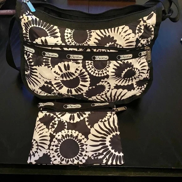Lesportsac bold, black and white circular print messenger bag with smaller zip close bag in same print.Adjustable strap.This set is versatile, use as your everyday bag, for...