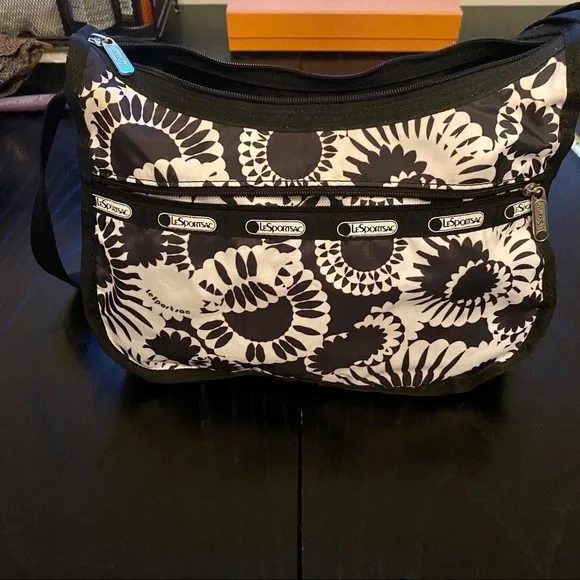 Lesportsac bold, black and white circular print messenger bag with smaller zip close bag in same print.Adjustable strap.This set is versatile, use as your everyday bag, for laptops, for traveling or even as a diaper bag.Excellent preloved condition, no flaws