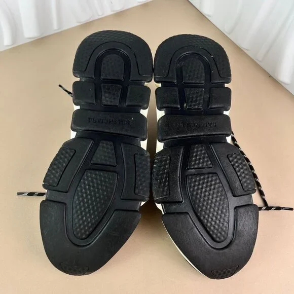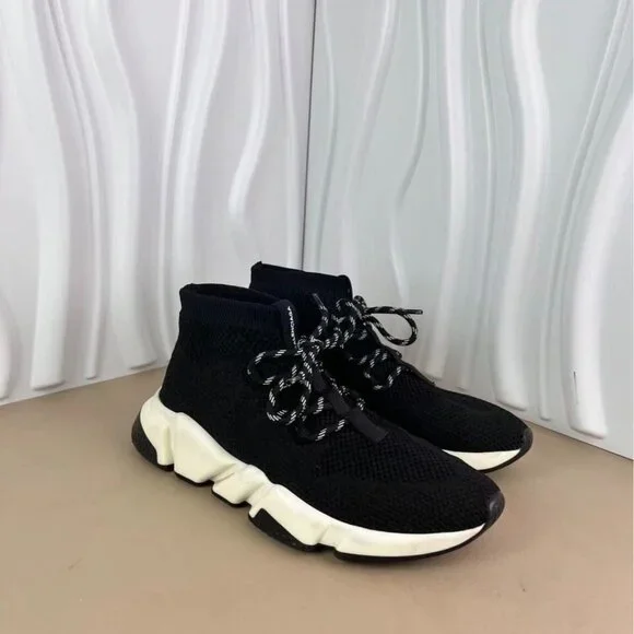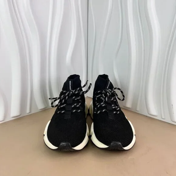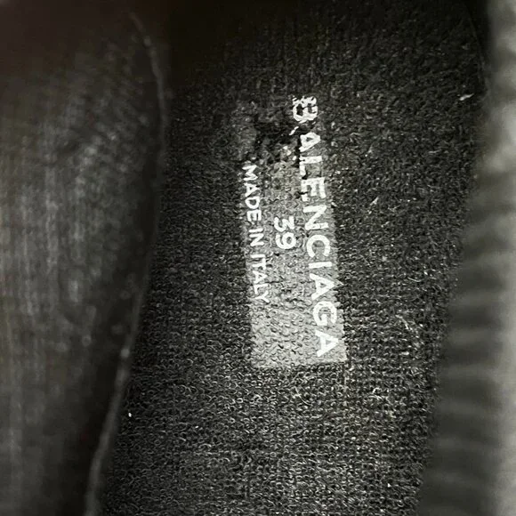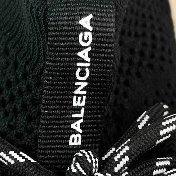 Breathable knit sneakers designed for comfort and style. These lightweight shoes feature a sock-like fit and durable sole construction for everyday wear.001062 39• Brand: Balenciaga• Size: 39 (EU)• Material: Knit fabric, rubber• Color: Black & white• Lace-up closure with striped laces• Lightweight, sock-like fit• Made in Italy