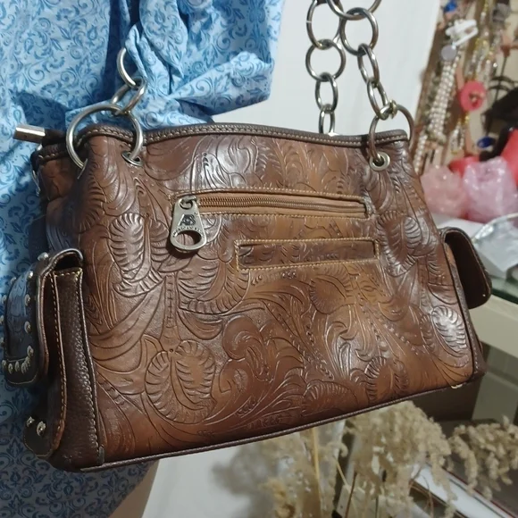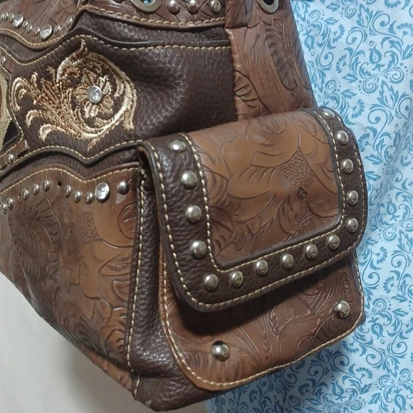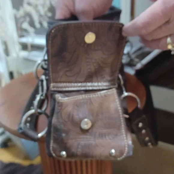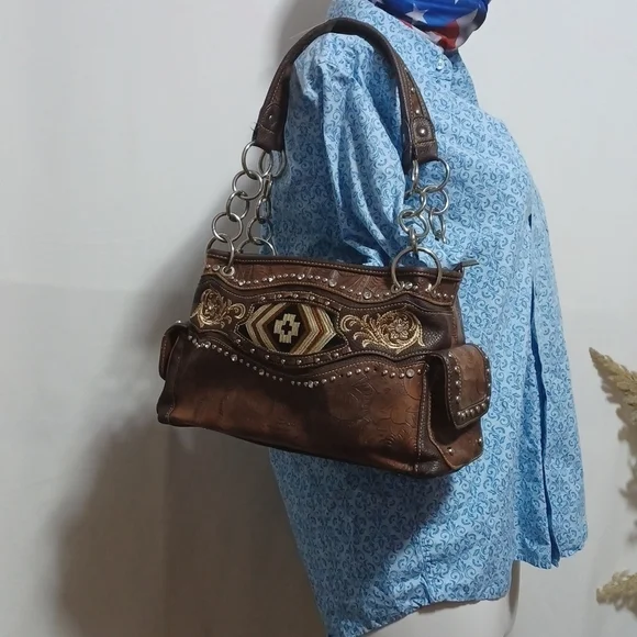 size 13 x 8in. and magnetic snaps and bead work and embroidery and leather and western style and I know that I used too many ands but this purse is beautiful and loaded with great...