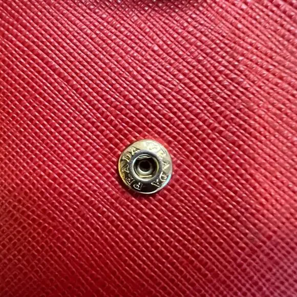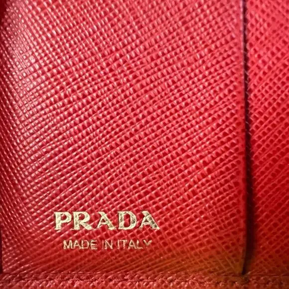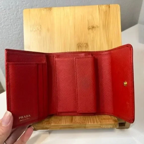 DESCRIPTION• Prada Wallet• Red Saffiano Lux Leather• Gold-Tone Hardware• Leather Lining with Card Slots• Snap ClosureDETAILSEstimated item measurementsHeight: 4" 3/4Width: 4"Depth: 1"Good Condition.Moderate scuffs throughout; moderate scratches and discoloration at hardware.
