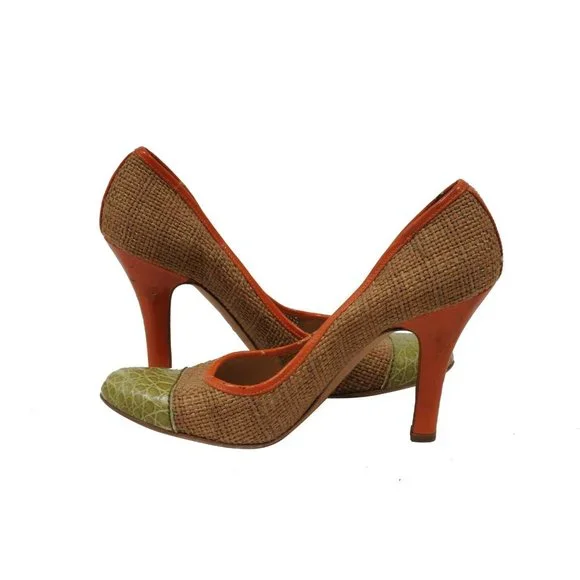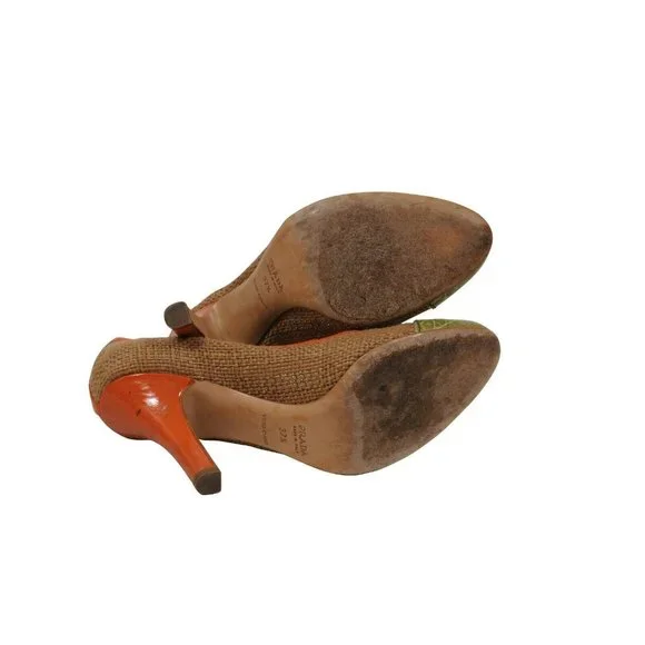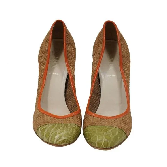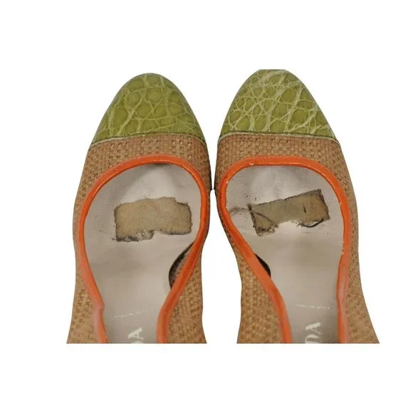 Prada Jute Heels Pumps Size 37.5 US 7.5 Tan Orange Green Croc Toe Box