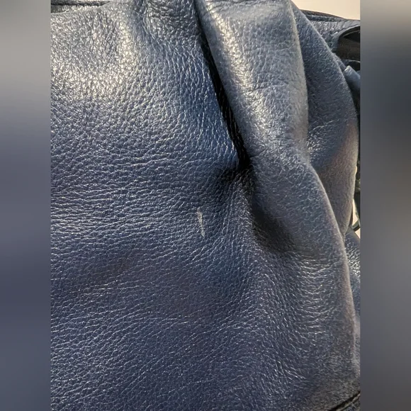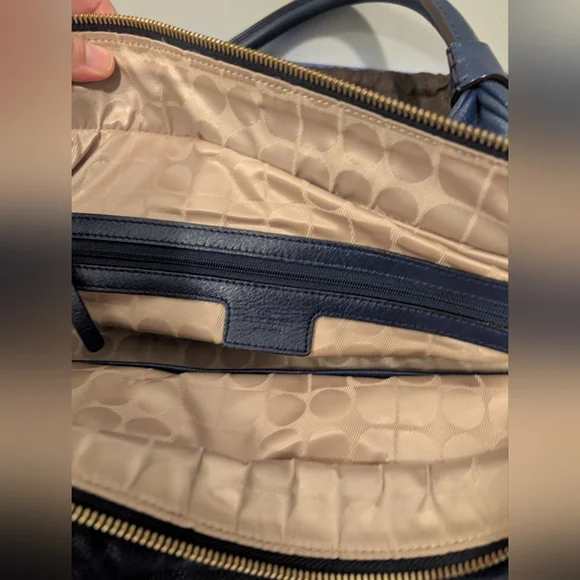 Large navy top handle purse. both sides have tassel accents. Zipper closure. Classic Kate Spade fabric inside. There is a scuff mark on the front as seen in the pictures.