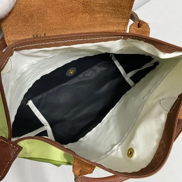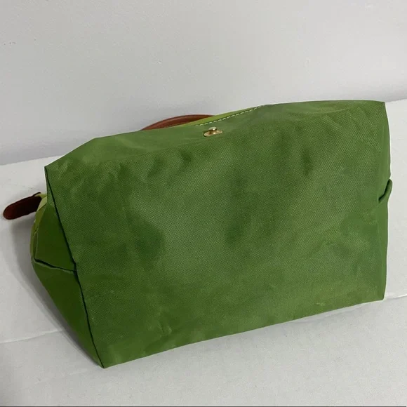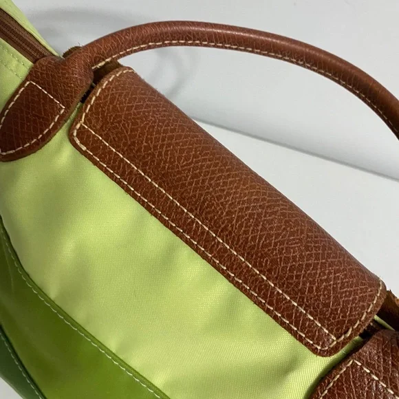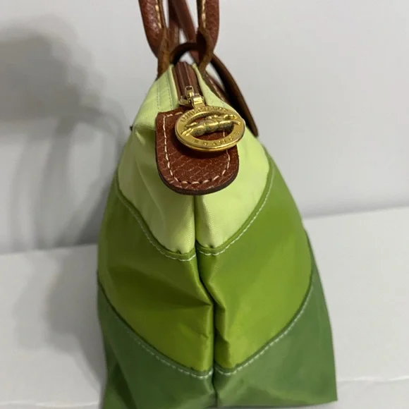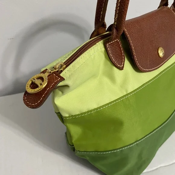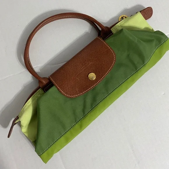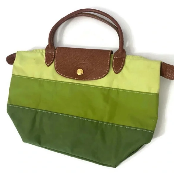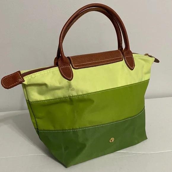 Longchamp tri color bag in 3 shades of green in canvas, double top handle in leather with 5" drop. You can hold this bag or put it through your wrist. Small stain in the back. Foldable bag. Very trendy