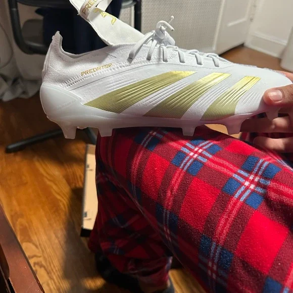 Adidas soccer cleats featuring a sleek white design with striking gold accents. Ideal for performance on the field.