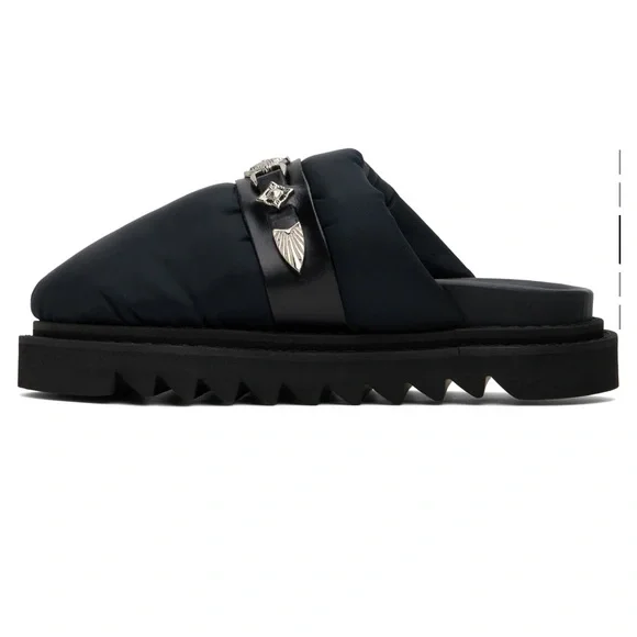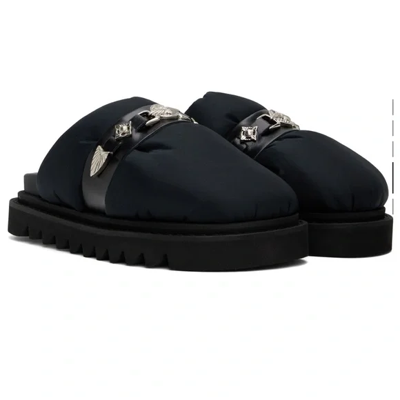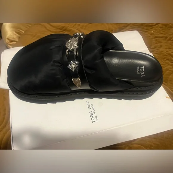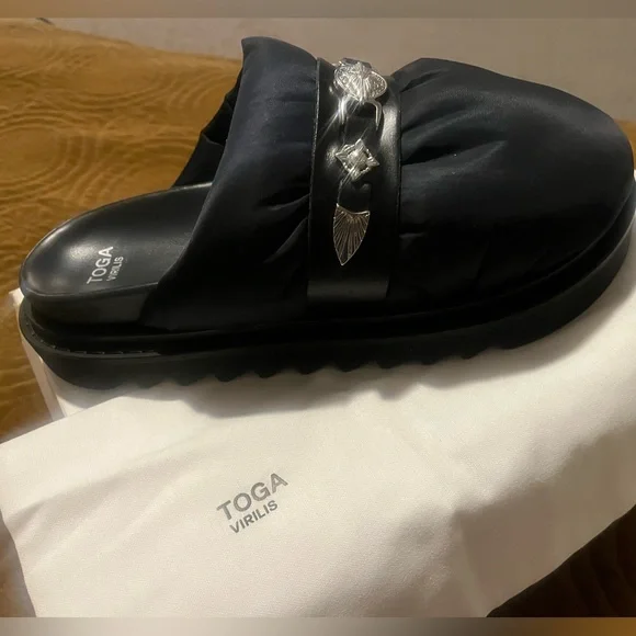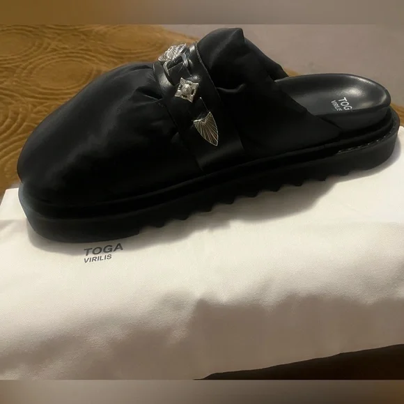 Size 46=13 US. ***NEVER WORN WITH BOX AND SHOE BAG***Padded nylon taffeta slippers in black.• Hardware at buffed leather strap• Molded buffed leather footbed• Foam rubber midsole• Treaded rubber soleSupplier color: BlackUpper: textile. Sole: rubber.Made in Portugal.