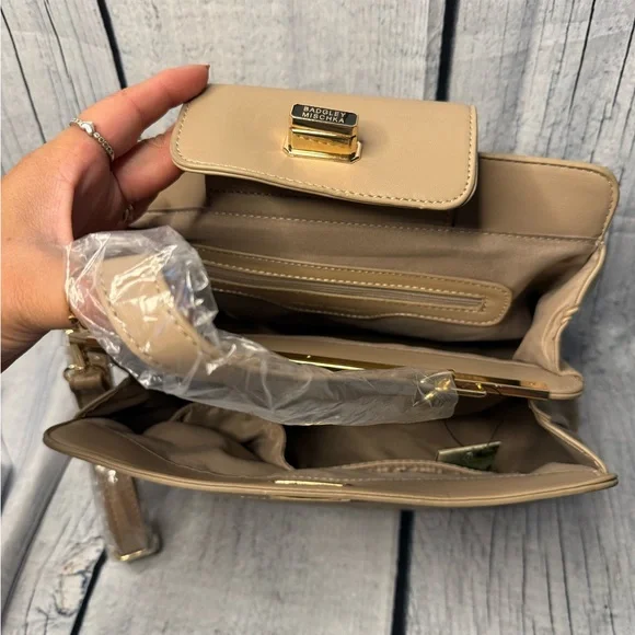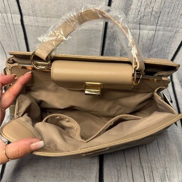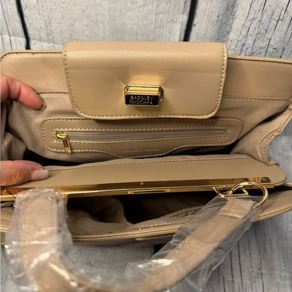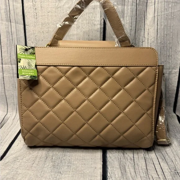 Experience timeless elegance with the Badgley Mischka Tan Quilted Satchel. This luxurious bag features a distinctive diamond quilted pattern and a structured design, perfect for...