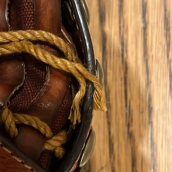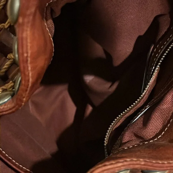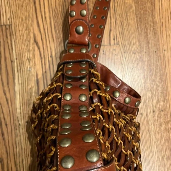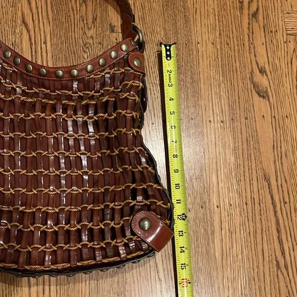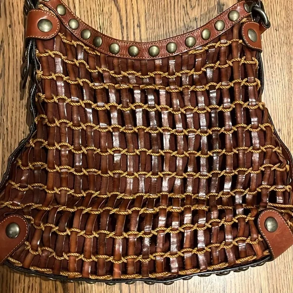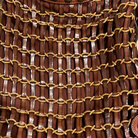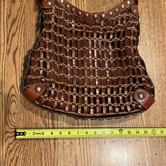 Kooba brown woven leather shoulder bag,inside zippered pocket, inside pouch pickets, magnetic closure, quality. See last pics for small rope blemish. Pre-used.
