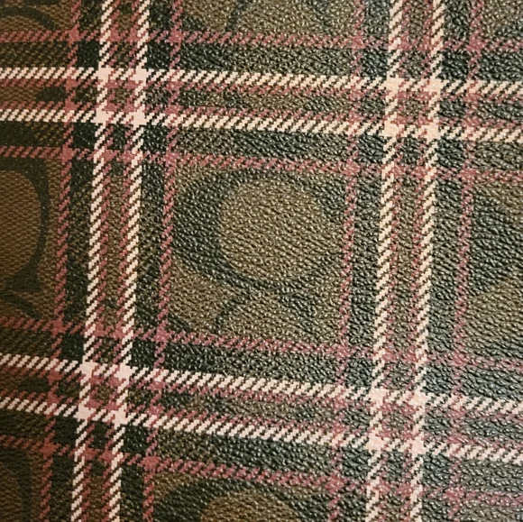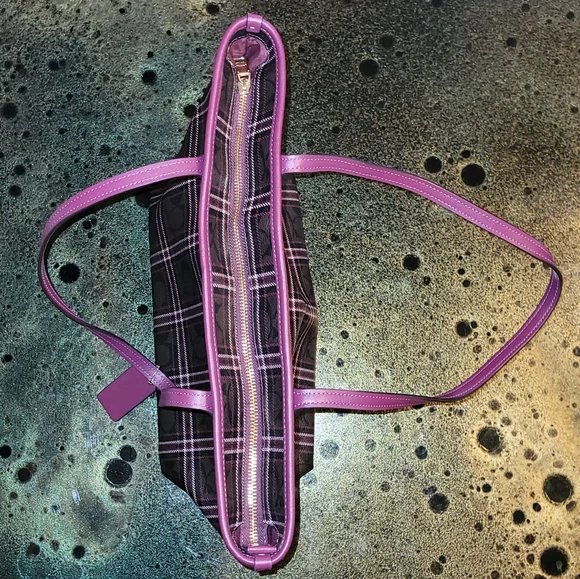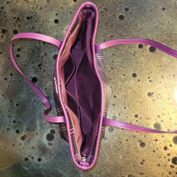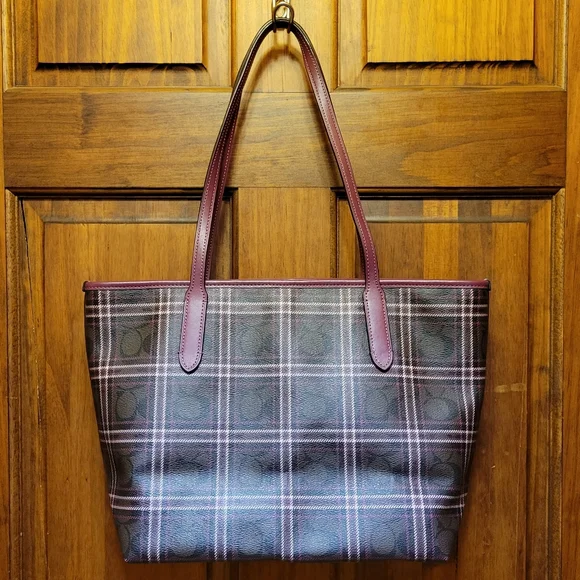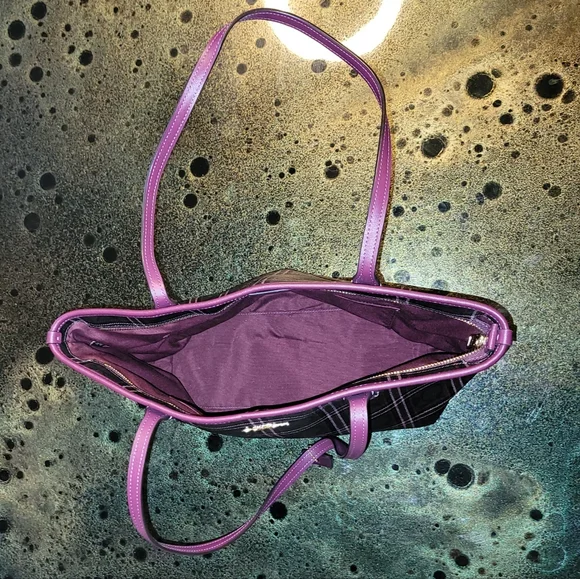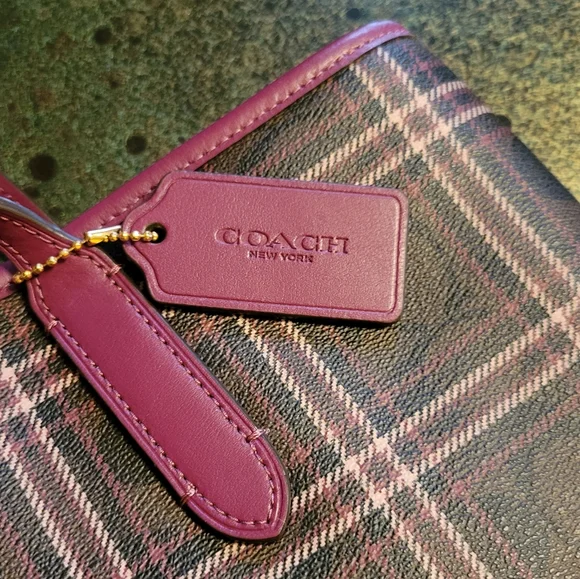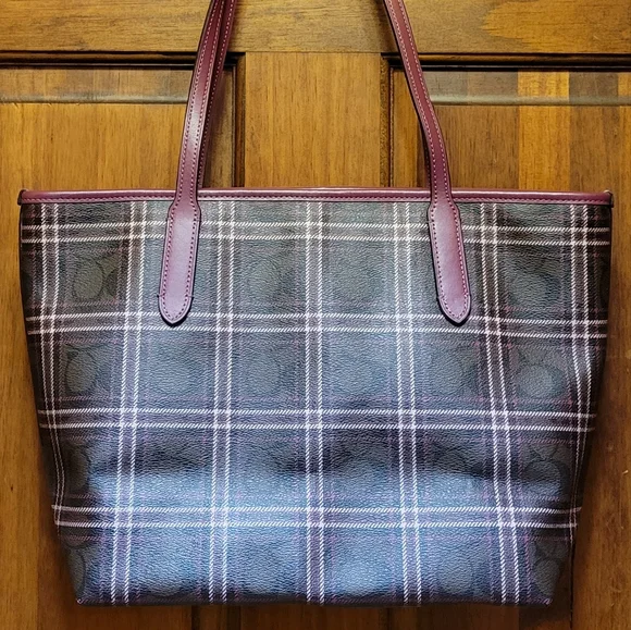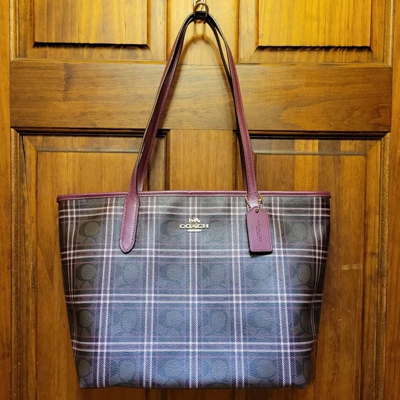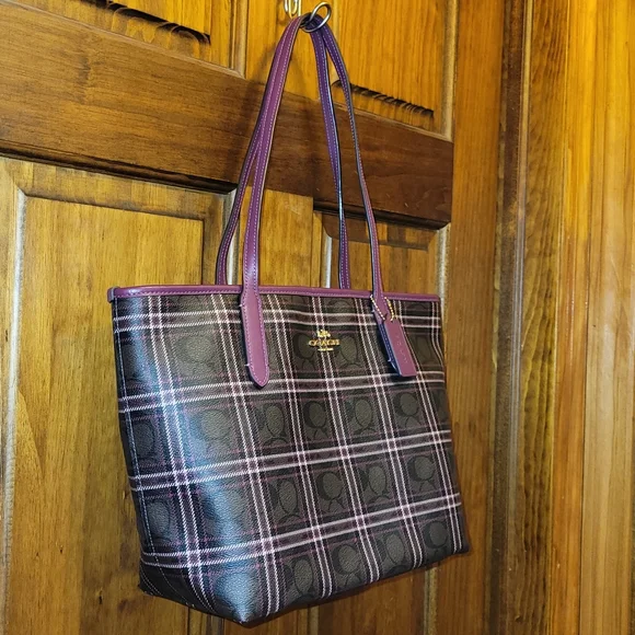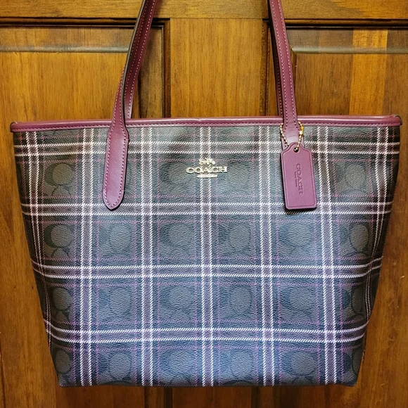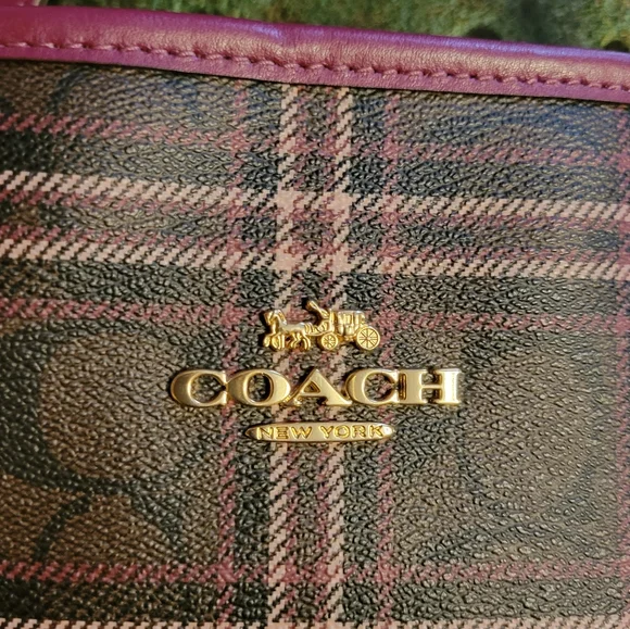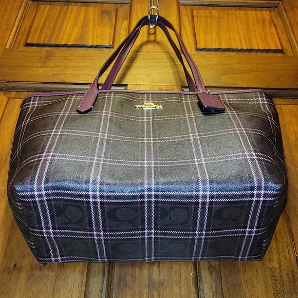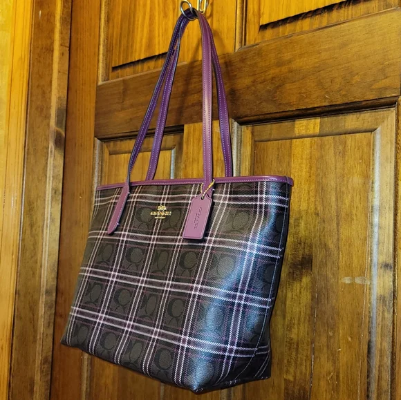 Coach Field Plaid Print Zip Top Tote Bag Signature Canvas Shoulder BagH1923-F80032Purple,Black,Brown & PinkSignature Coated Canvas With Smooth Purple LeatherZipper ClosureGoldtone...