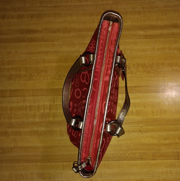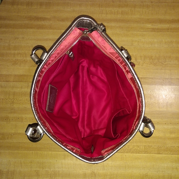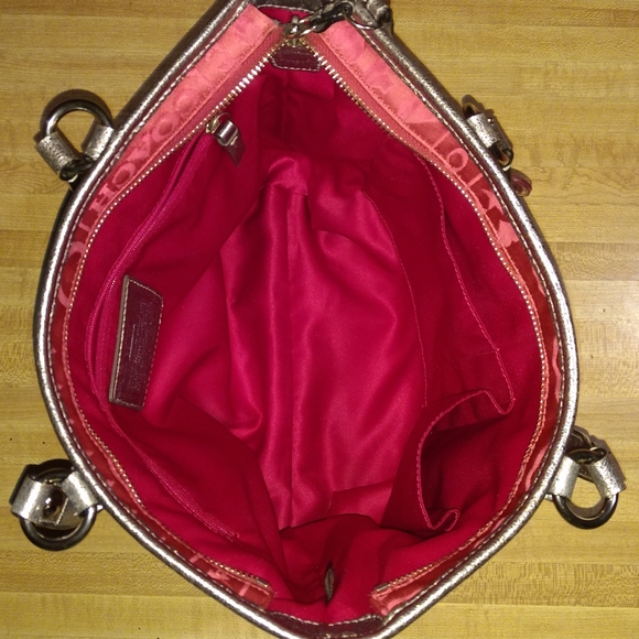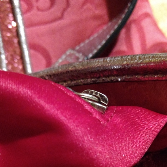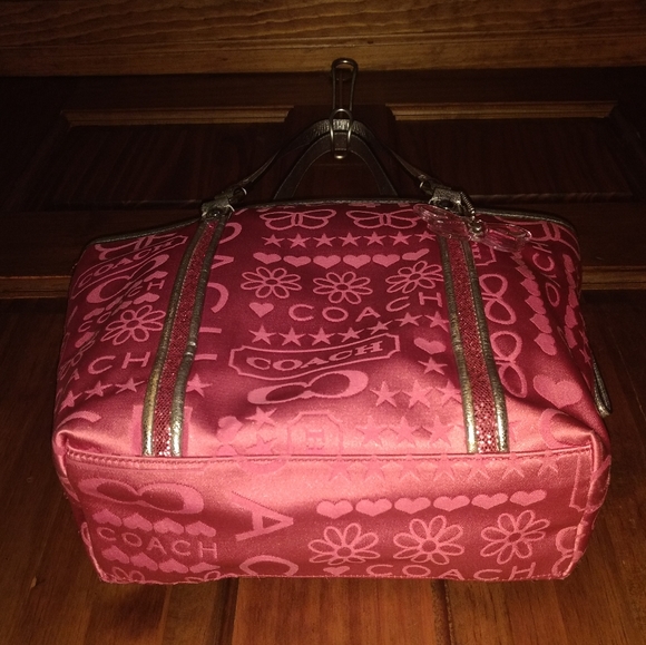 COACH BANDANA GLITTER GRAFFITI PINK TOTE SHOULDER BAGK1082-F15709Zipper ClosurePink Satin With Silver Metallic Leather Trim WithPink Glitter DetailSilvertone HardwareCoach...