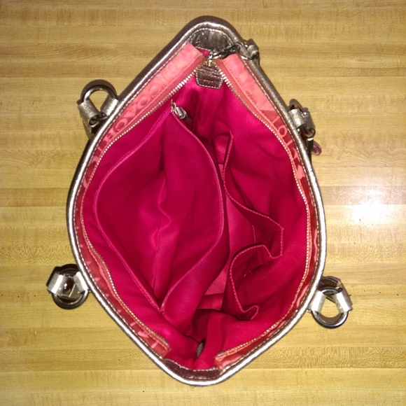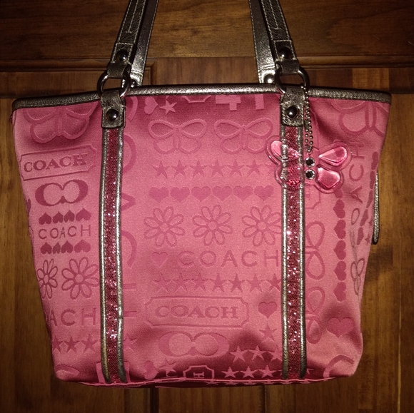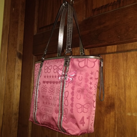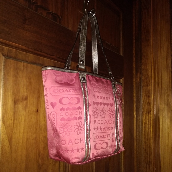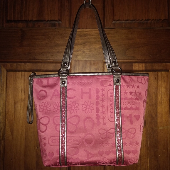 COACH BANDANA GLITTER GRAFFITI PINK TOTE SHOULDER BAGK1082-F15709Zipper ClosurePink Satin With Silver Metallic Leather Trim WithPink Glitter DetailSilvertone HardwareCoach Butterfly HangtagInside Zipper Pocket & 2 Slip PocketsPink Satin LiningMeasurements9.5" Height3.5" Wide9.5" Length8.5" Handles DropPre-Owned Gently Used Condition
