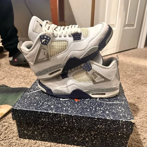 Classic Air Jordan 4 design. White leather with navy accents. Iconic silhouette.