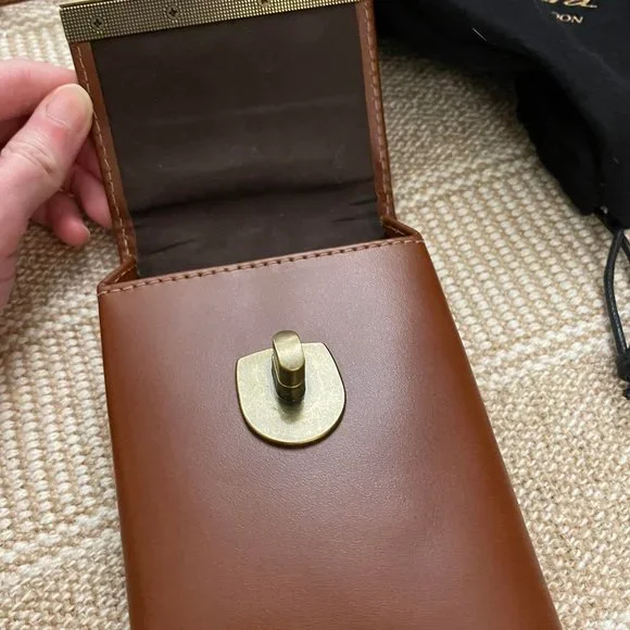 Perfect Condition. Never worn outside.Lightweight Mobile Phone Bag with Card Slots and Keys HolderThis bag is a special edition for those who carry only the essentials. A unique easy open clip gives you access to your phone while on the back card slots hold those essential cards while the back slip pocket keeps your keys tidy and secure. A fantastic light weight bag for gentle walks or epic adventures.FEATURESUnique brass front clipRear card slotsSecure keys sectionAdjustable shoulder strapFits up to Iphone 13 pro, Samsung galaxy s21, Huawei P30 ProDETAILSLeather : 100% Cow LeatherInner Lining : 100% CottonDimensions in cm : Width 9,Height 16, Depth 3Weight : 200gStrap length : 122cm