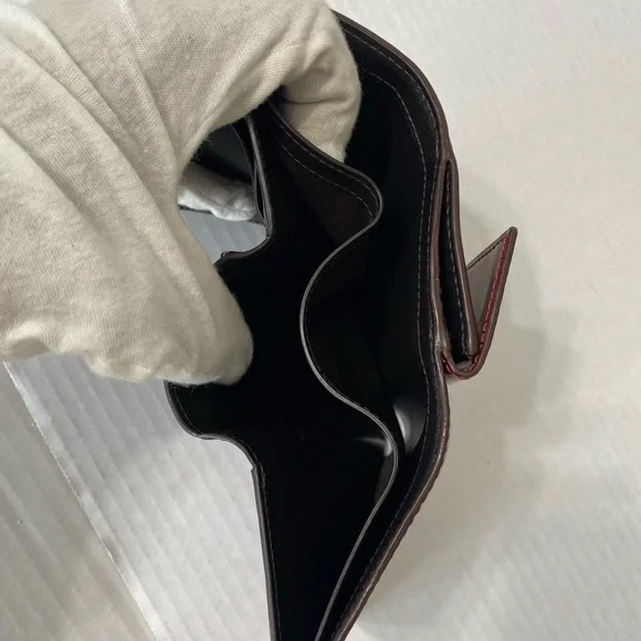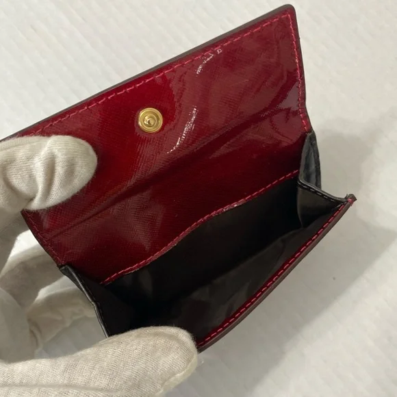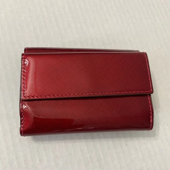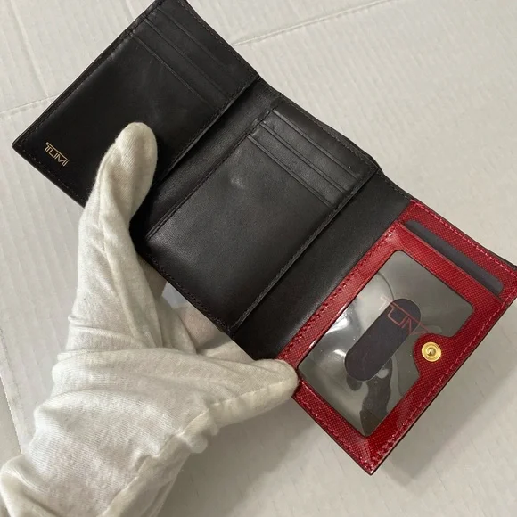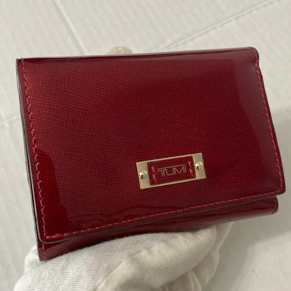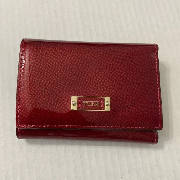 Tumi red wallet in a patent leather, snap closure, coin compartment, 6 CC slots, 2 slid compartments, 2 money compartments, like new.