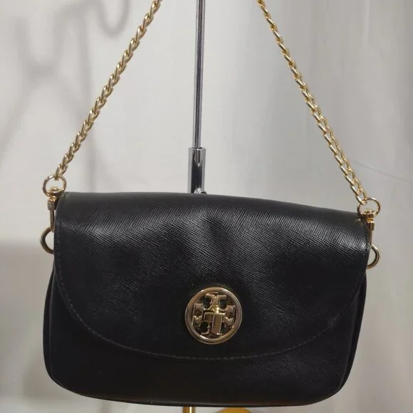TORY BURCH Black Leather Crossbody With Turquoise Fabric Lining