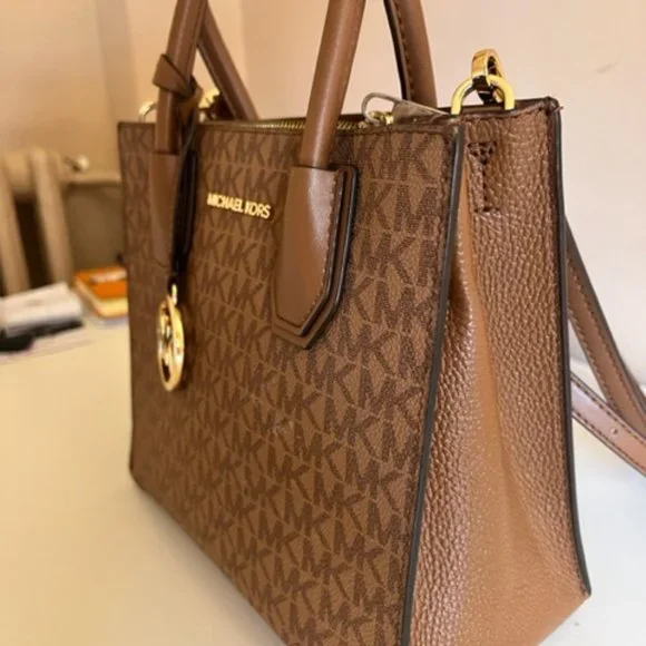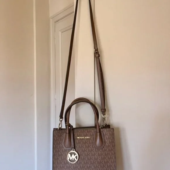 Lightly used bag that is perfect for everyday wear, easily combinable with most outfits and holds a lot of space for your essentials. The material is coated canvas leather and comes with an adjustable strap that is removeable to make it a handbag, as well as the MK logo charm.