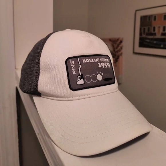 Ping Collection "Rollin since 1959" Meshback White, Black & Gray Patch Logo Hat.