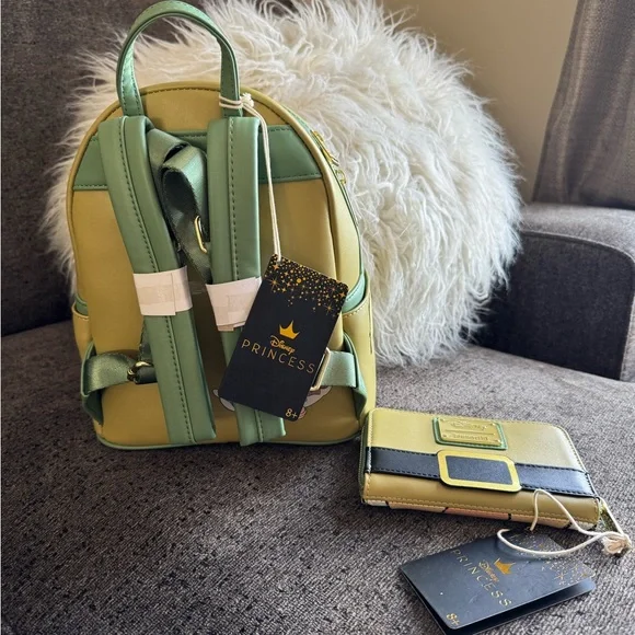 NWT Loungefly Adorable Disney Princess Sleepy backpack and wallet set. Features a playful Sleepy design with green and cream colors.Mini backpack 11”x9”x5”. Adjustable...